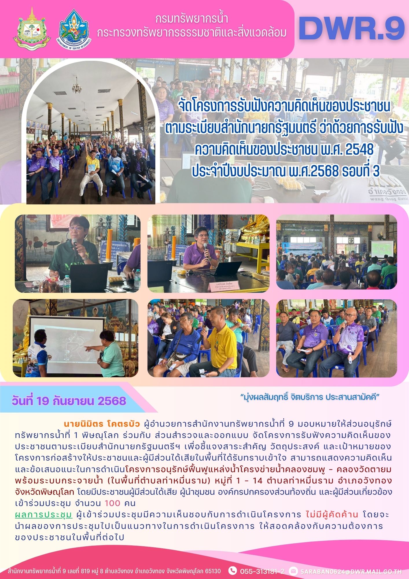 เมื่อวันที่ 19 กันยายน 2568 นายนิมิตร โคตรบัว ผู้อำนวยการสำนักงานทรัพยากรน้ำที่ 9 มอบหมายให้ส่วนอนุรักษ์ทรัพยากรน้ำที่ 1 พิษณุโลก ร่วมกับ ส่วนสำรวจและออกแบบ จัดโครงการรับฟังความคิดเห็นของประชาชนตามระเบียบสำนักนายกรัฐมนตรีฯ เพื่อชี้แจงสาระสำคัญ วัตถุประสงค์ และเป้าหมายของโครงการก่อสร้างให้ประชาชนและผู้มีส่วนได้เสียในพื้นที่ได้รับทราบเข้าใจ สามารถแสดงความคิดเห็นและข้อเสนอแนะในการดำเนินโครงการอนุรักษ์ฟื้นฟูแหล่งน้ำโครงข่ายน้ำคลองชมพู - คลองวัดตายม พร้อมระบบกระจายน้ำ (ในพื้นที่ตำบลท่าหมื่นราม) หมู่ที่ 1 - 14 ตำบลท่าหมื่นราม อำเภอวังทอง จังหวัดพิษณุโลก โดยมีประชาชนผู้มีส่วนได้เสีย ผู้นำชุมชน องค์กรปกครองส่วนท้องถิ่น และผู้มีส่วนเกี่ยวข้อง เข้าร่วมประชุม จำนวน 100 คน ผลการประชุม ผู้เข้าร่วมประชุมมีความเห็นชอบกับการดำเนินโครงการ ไม่มีผู้คัดค้าน โดยจะนำผลของการประชุมไปเป็นแนวทางในการดำเนินโครงการ ให้สอดคล้องกับความต้องการของประชาชนในพื้นที่ต่อไป