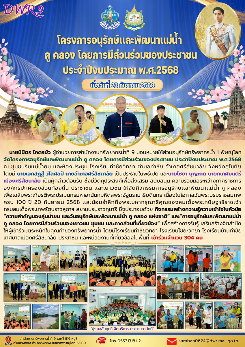 โครงการอนุรักษ์เเละพัฒนาเเม่น้ำ คู คลอง โดยการมีส่วนร่วมของประชาชน ประจำปีงบประมาณ พ.ศ.2568 เมื่อวันที่ 23 กันยายน 2568 นายนิมิตร โคตรบัว ผู้อำนวยการสำนักงานทรัพยากรน้ำที่ 9 มอบหมายให้ส่วนอนุรักษ์ทรัพยากรน้ำ 1 พิษณุโลก จัดโครงการอนุรักษ์เเละพัฒนาเเม่น้ำ คู คลอง โดยการมีส่วนร่วมของประชาชน ประจำปีงบประมาณ พ.ศ.2568 ณ ชุมชนริมเเม่น้ำยม เเละห้องประชุม โรงเรียนท่าชัยวิทยา ตำบลท่าชัย อำเภอศรีสัชนาลัย จังหวัดสุโขทัย โดยมี นายเอกสิฏฐ์ วิไลศิลป์ นายอำเภอศรีสัชนาลัย เป็นประธานในพิธีเปิด เเละนายไชยา บุญเกิด นายกเทศมนตรีเมืองศรีสัชนาลัย เป็นผู้กล่าวต้อนรับ ซึ่งมีวัตถุประสงค์เพื่อส่งเสริม สนับสนุน ความร่วมมือระหว่างภาคราชการองค์กรปกครองส่วนท้องถิ่น ประชาชน เเละเยาวชน ให้จัดกิจกรรมการอนุรักษ์เเละพัฒนาเเม่น้ำ คู คลอง เพื่อเฉลิมพระเกียรติพระปรเมนทรมหาอานันทมหิดลพระอัฐมรามาธิบดินทร เนื่องในโอกาสวันพระบรมราชสมภพครบ 100 ปี 20 กันยายน 2568 เเละน้อมรำลึกถึงพระมหากรุณาธิคุณของสมเด็จพระกนิษฐาธิราชเจ้า กรมสมเด็จพระเทพรัตนราชสุดาฯ สยามบรมราชกุมารี ซึ่งประกอบด้วย กิจกรรมสร้างความรู้ความเข้าใจในหัวข้อ “ความสำคัญของลุ่มน้ำยม เเละวันอนุรักษ์เเละพัฒนาเเม่น้ำ คู คลอง เเห่งชาติ” เเละ“การอนุรักษ์เเละพัฒนาเเม่น้ำ คู คลอง โดยการมีส่วนร่วมของเยาวชน ชุมชน เเละภาคส่วนที่เกี่ยวข้อง” เพื่อสร้างการรับรู้ เสริมสร้างจิตสำนึกให้ผู้เข้าร่วมตระหนักในคุณค่าของทรัพยากรน้ำ โดยมีโรงเรียนท่าชัยวิทยา โรงเรียนไชยะวิทยา โรงเรียนบ้านท่าชัย เทศบาลเมืองศรีสัชนาลัย ประชาชน เเละหน่วยงานที่เกี่ยวข้องในพื้นที่ เข้าร่วมจำนวน 304 คน