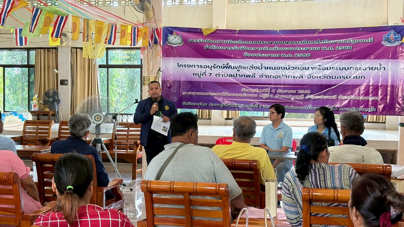 วันพฤหัสบดีที่ 4 กันยายน 2568 เวลา 09.00 น. นายสิทธิพงษ์ โกวพัฒนกิจ ผู้อำนวยการสำนักงานทรัพยากรน้ำที่ 6 มอบหมายให้ส่วนอนุรักษ์ทรัพยากรน้ำที่ 1 ปราจีนบุรี ดำเนินการจัดรับฟังความคิดเห็นของประชาชน ตามระเบียบสำนักนายกรัฐมนตรี ว่าด้วยการรับฟังความคิดเห็นของประชาชน พ.ศ. 2548 โครงการอนุรักษ์ฟื้นฟูแหล่งน้ำหนองบัวขอน พร้อมระบบกระจายน้ำ หมู่ที่ 7 ตำบลปากพลี อำเภอปากพลี จังหวัดนครนายก ณ ศาลาอเนกประสงค์วัดหนองบัวขอน หมู่ที่ 7 ตำบลปากพลี อำเภอปากพลี จังหวัดนครนายก ผู้เข้าร่วมประชุมประกอบด้วย ปลัดอำเภอปากพลี สมาชิกสภาองค์การบริหารส่วนจังหวัดนครนายก เขต 1 ปากพลี รองนายกองค์การบริหารส่วนตำบลปากพลี ปลัดองค์การบริหารส่วนตำบลปากพลี ผู้แทนสำนักงานทรัพยากรธรรมชาติและสิ่งแวดล้อมจังหวัดนครนายก เจ้าหน้าที่ศูนย์ป่าไม้นครนายก ผู้นำชุมชนและผู้มีส่วนได้ส่วนเสียต่อโครงการ จำนวนทั้งสิ้น 63 คน โดยมีวัตถุประสงค์ของโครงการ เพื่อชี้แจงให้ผู้มีส่วนได้ส่วนเสียเข้าใจในสาระสำคัญโครงการ และให้ทราบถึงขั้นตอนการดำเนินงาน พร้อมทั้ง ร่วมแสดงความคิดเห็นและข้อเสนอแนะต่อโครงการ ซึ่งผลการรับฟัง "มีมติเห็นชอบให้ดำเนินโครงการ" ทั้งนี้ สำนักงานทรัพยากรน้ำที่ 6 จะนำข้อเสนอแนะและความต้องการของที่ประชุมไปเป็นแนวทาง เพื่อขอรับการสนับสนุนงบประมาณปี 2570 ในการก่อสร้างโครงการต่อไป