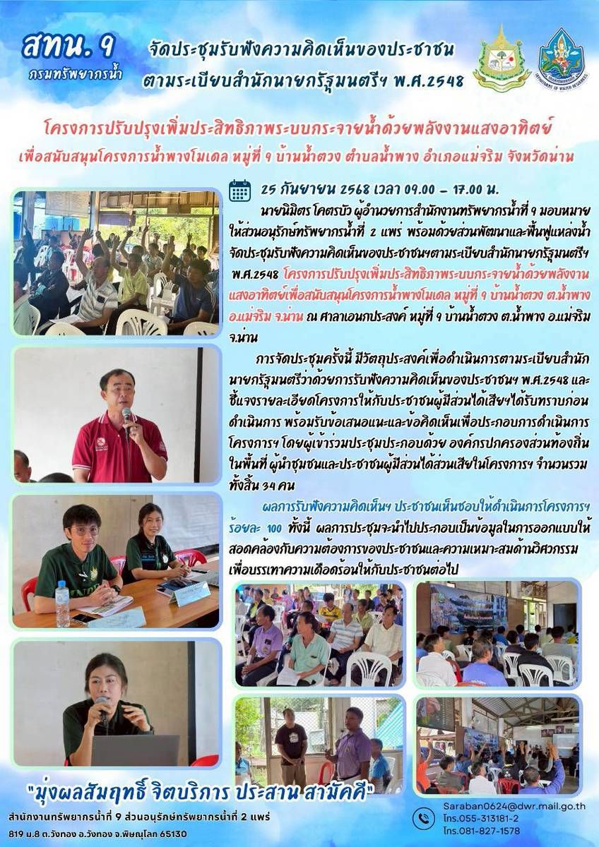 นายนิมิตร โคตรบัว ผู้อำนวยการสำนักงานทรัพยากรน้ำที่ 9 มอบหมายให้ส่วนอนุรักษ์ทรัพยากรน้ำที่ 2 แพร่ พร้อมด้วยส่วนพัฒนาและฟื้นฟูแหล่งน้ำ จัดประชุมรับฟังความคิดเห็นของประชาชนฯ ตามระเบียบสำนักนายกรัฐมนตรีฯ พ.ศ.2548 โครงการปรับปรุงเพิ่มประสิทธิภาพระบบกระจายน้ำ ด้วยพลังงานแสงอาทิตย์เพื่อสนับสนุนโครงการน้ำพางโมเดล หมู่ที่ 9 บ้านน้ำตวงตำบลน้ำพาง อำเภอแม่จริม จังหวัดน่าน ณ ศาลาเอนกประสงค์หมู่ที่ 9 บ้านน้ำตวง ตำบลน้ำพาง อำเภอแม่จริม จังหวัดน่าน