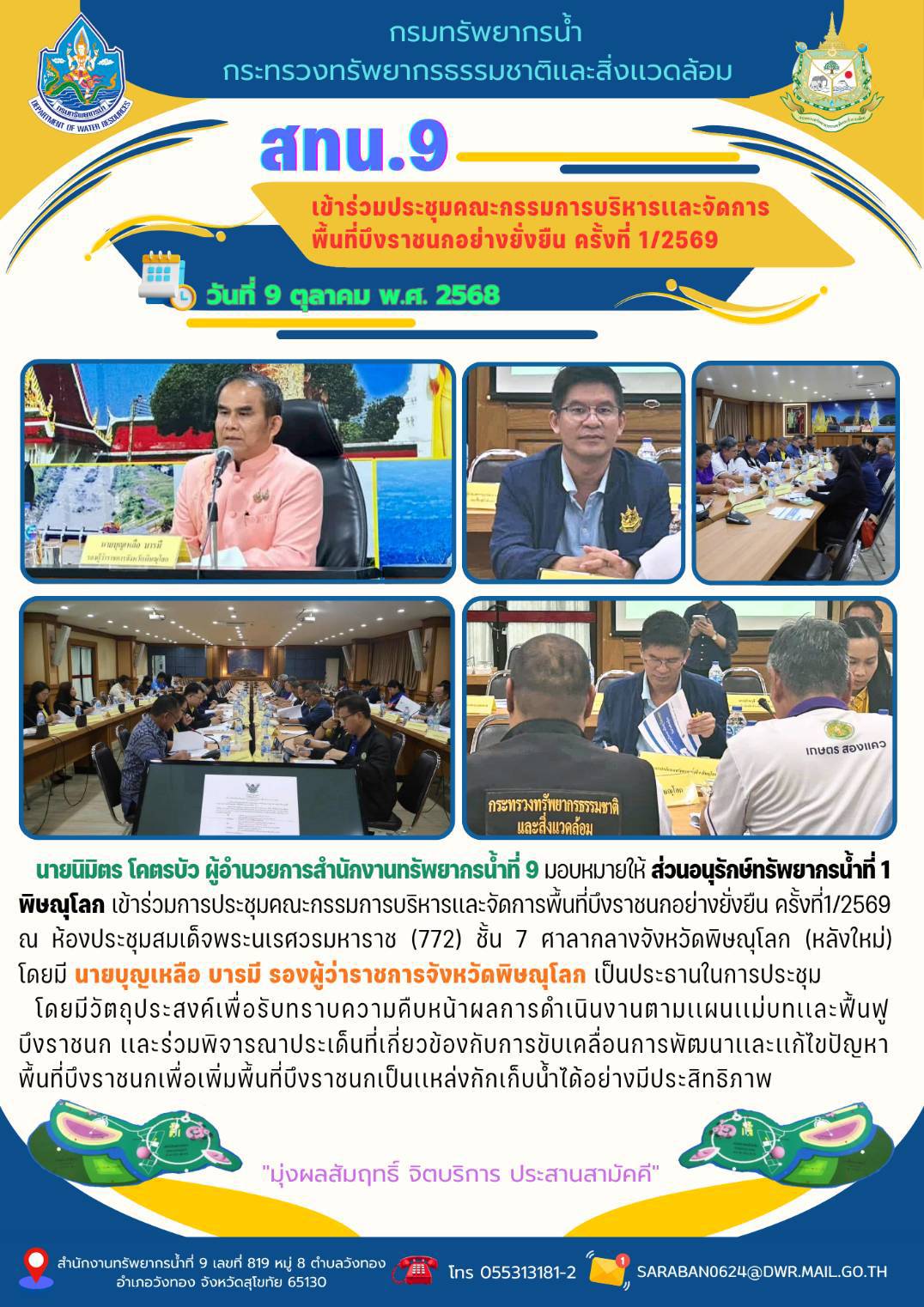 เมื่อวันที่ 9 ตุลาคม พ.ศ. 2568 นายนิมิตร โคตรบัว ผู้อำนวยการสำนักงานทรัพยากรน้ำที่ 9 มอบหมายให้ ส่วนอนุรักษ์ทรัพยากรน้ำที่ 1 พิษณุโลก เข้าร่วมการประชุมคณะกรรมการบริหารเเละจัดการพื้นที่บึงราชนกอย่างยั่งยืน ครั้งที่1/2569 ณ ห้องประชุมสมเด็จพระนเรศวรมหาราช (772) ชั้น 7 ศาลากลางจังหวัดพิษณุโลก (หลังใหม่) โดยมี นายบุญเหลือ บารมี รองผู้ว่าราชการจังหวัดพิษณุโลก เป็นประธานในการประชุม โดยมีวัตถุประสงค์เพื่อรับทราบความคืบหน้าผลการดำเนินงานตามเเผนเเม่บทเเละฟื้นฟูบึงราชนก เเละร่วมพิจารณาประเด็นที่เกี่ยวข้องกับการขับเคลื่อนการพัฒนาเเละเเก้ไขปัญหาพื้นที่บึงราชนกเพื่อเพิ่มพื้นที่บึงราชนกเป็นเเหล่งกักเก็บน้ำได้อย่างมีประสิทธิภาพ