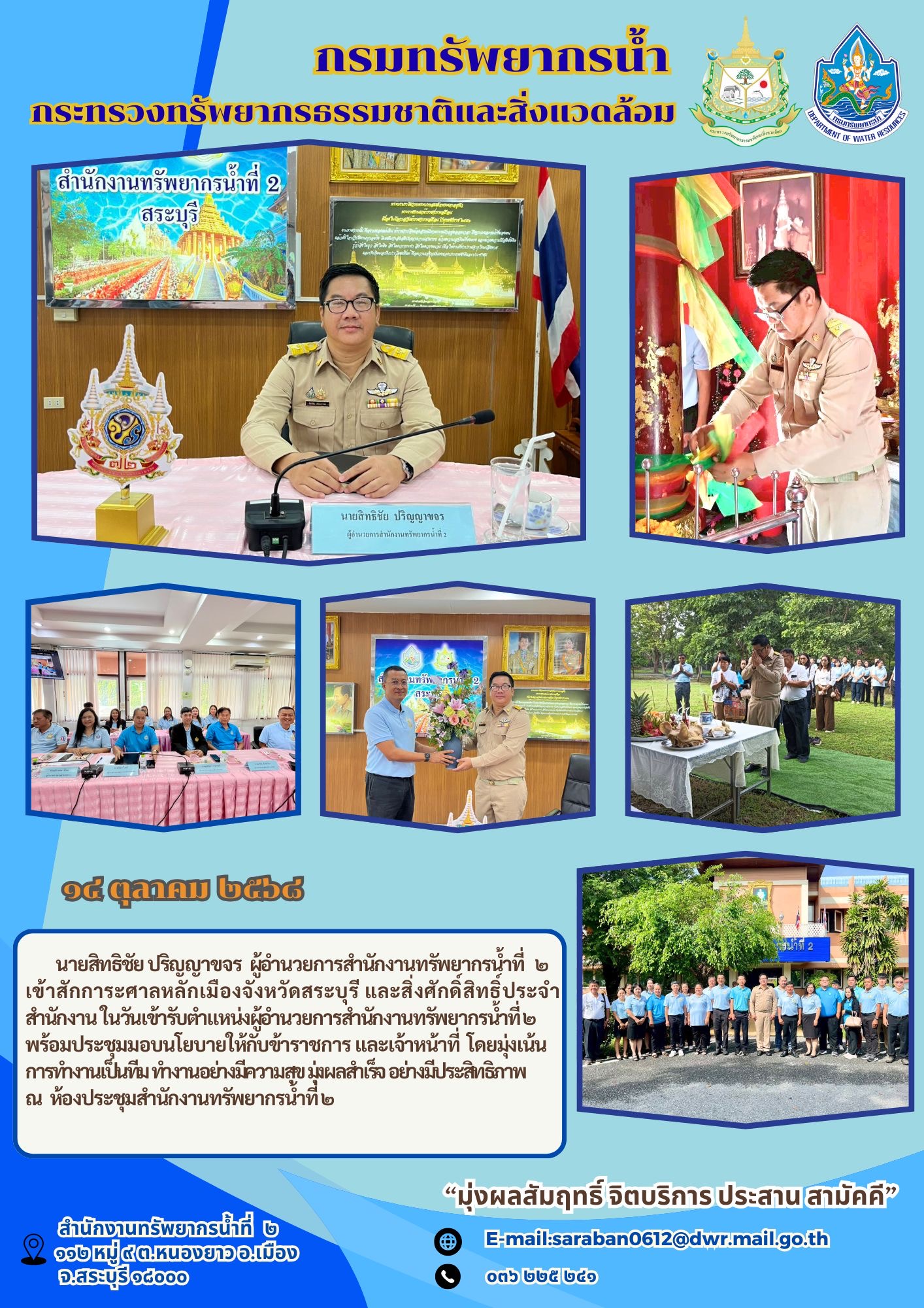 นายสิทธิชัย ปริญญาขจร ผู้อำนวยการสำนักงานทรัพยากรน้ำที่ ๒ เข้าสักการะศาลหลักเมืองจังหวัดสระบุรี และสิ่งศักดิ์สิทธิ์ประจำสำนักงาน ในวันเข้ารับตำแหน่งผู้อำนวยการสำนักงานทรัพยากรน้ำที่ ๒ พร้อมประชุมมอบนโยบายให้กับข้าราชการ และเจ้าหน้าที่ โดยมุ่งเน้นการทำงานเป็นทีม ทำงานอย่างมีความสุข มุ่งผลสำเร็จ อย่างมีประสิทธิภาพ ณ ห้องประชุมสำนักงานทรัพยากรน้ำที่ ๒
