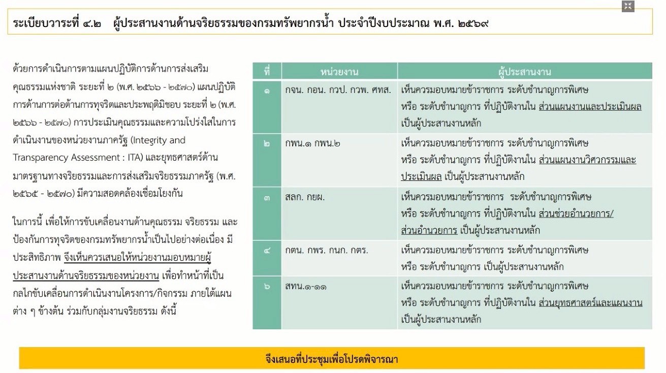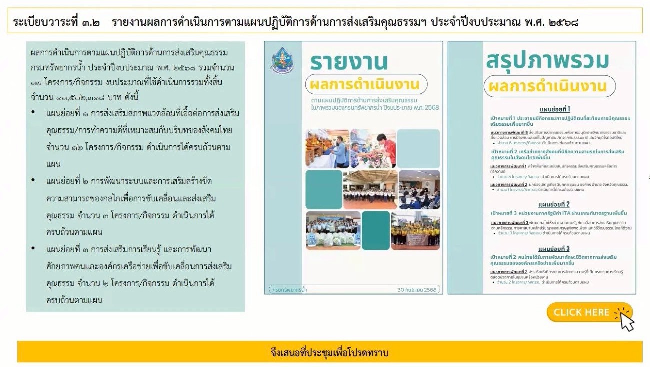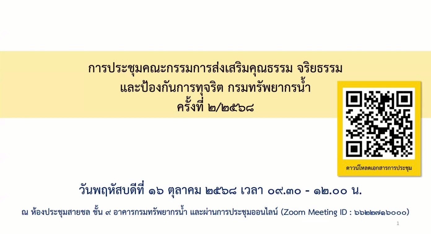 นางสาวสุพัดสอน สีมืด ผู้อำนวยการสำนักงานทรัพยากรน้ำที่ 1 มอบหมายให้ส่วนยุทธศาสตร์และแผนงาน เข้าร่วมประชุมคณะกรรมการส่งเสริมคุณธรรม จริยธรรม และป้องกันการทุจริต กรมทรัพยากรน้ำ ครั้งที่ 2/2568 ผ่านระบบการประชุมออนไลน์ Zoom Meeting โดยมี นายกิตติ จันทร์ส่อง เลขานุการกรม เป็นประธานการประชุม ได้แจ้งเรื่องเพื่อทราบจำนวน 2 เรื่อง ได้แก่ (1) การประเมินองค์กรคุณธรรม ประจำปีงบประมาณ พ.ศ. 2568 ของกรมทรัพยากรน้ำ (2) รายงานผลการดำเนินการตามแผนปฏิบัติการด้านการส่งเสริมคุณธรรมในภาพรวมของกรมทรัพยากรน้ำ ประจำปีงบประมาณ พ.ศ. 2568 และในที่ประชุมได้ร่วมกันพิจารณา การรายงานผลการดำเนินการตามมาตรฐานทางจริยธรรม ประมวลจริยธรรมข้อกำหนดจริยธรรม และกระบวนการรักษาจริยธรรม ประจำปีงบประมาณ พ.ศ. 2568 และ ผู้ประสานงานด้านจริยธรรมของกรมทรัพยากรน้ำ ประจำปีงบประมาณ พ.ศ. 2569