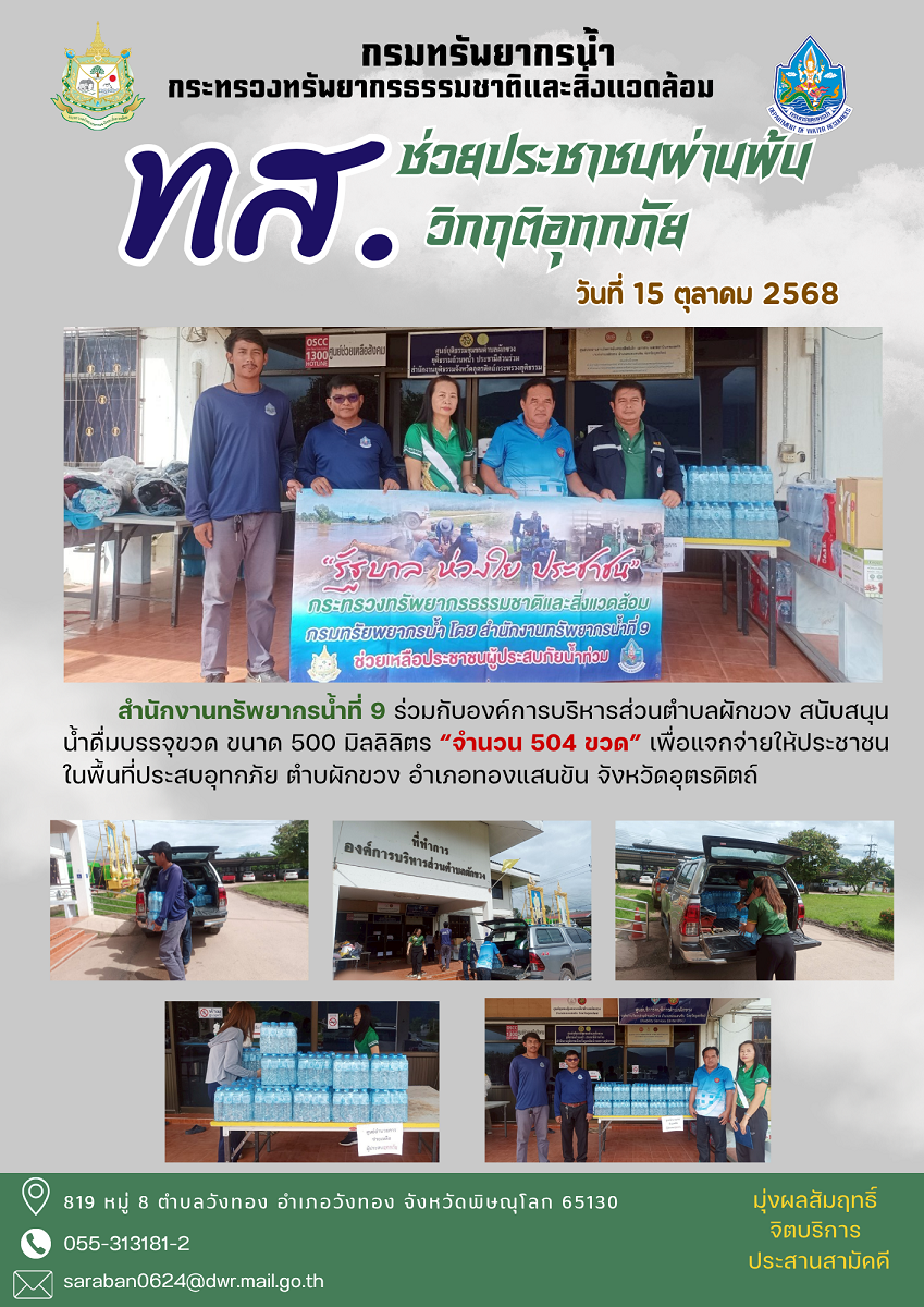 ทส.ช่วยประชาชน ผ่านพ้นวิกฤติอุทกภัย วันที่ 15 ตุลาคม 2568 สำนักงานทรัพยากรน้ำที่ 9 ร่วมกับองค์การบริหารส่วนตำบลผักขวง สนับสนุนน้ำดื่มบรรจุขวด ขนาด 500 มิลลิลิตร “จำนวน 504 ขวด” เพื่อแจกจ่ายให้ประชาชน ในพื้นที่ประสบอุทกภัย ตำบผักขวง อำเภอทองแสนขัน จังหวัดอุตรดิตถ์