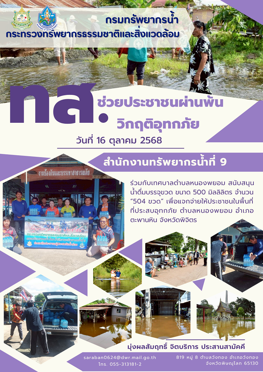 ทส.ช่วยประชาชน ผ่านพ้นวิกฤติอุทกภัย วันที่ 16 ตุลาคม 2568 สำนักงานทรัพยากรน้ำที่ 9 ร่วมกับเทศบาลตำบลหนองพยอม สนับสนุนน้ำดื่มบรรจุขวด ขนาด 500 มิลลิลิตร “จำนวน 504 ขวด” เพื่อแจกจ่ายให้ประชาชน ในพื้นที่ประสบอุทกภัย ตำบลหนองพยอม อำเภอตะพานหิน จังหวัดพิจิตร