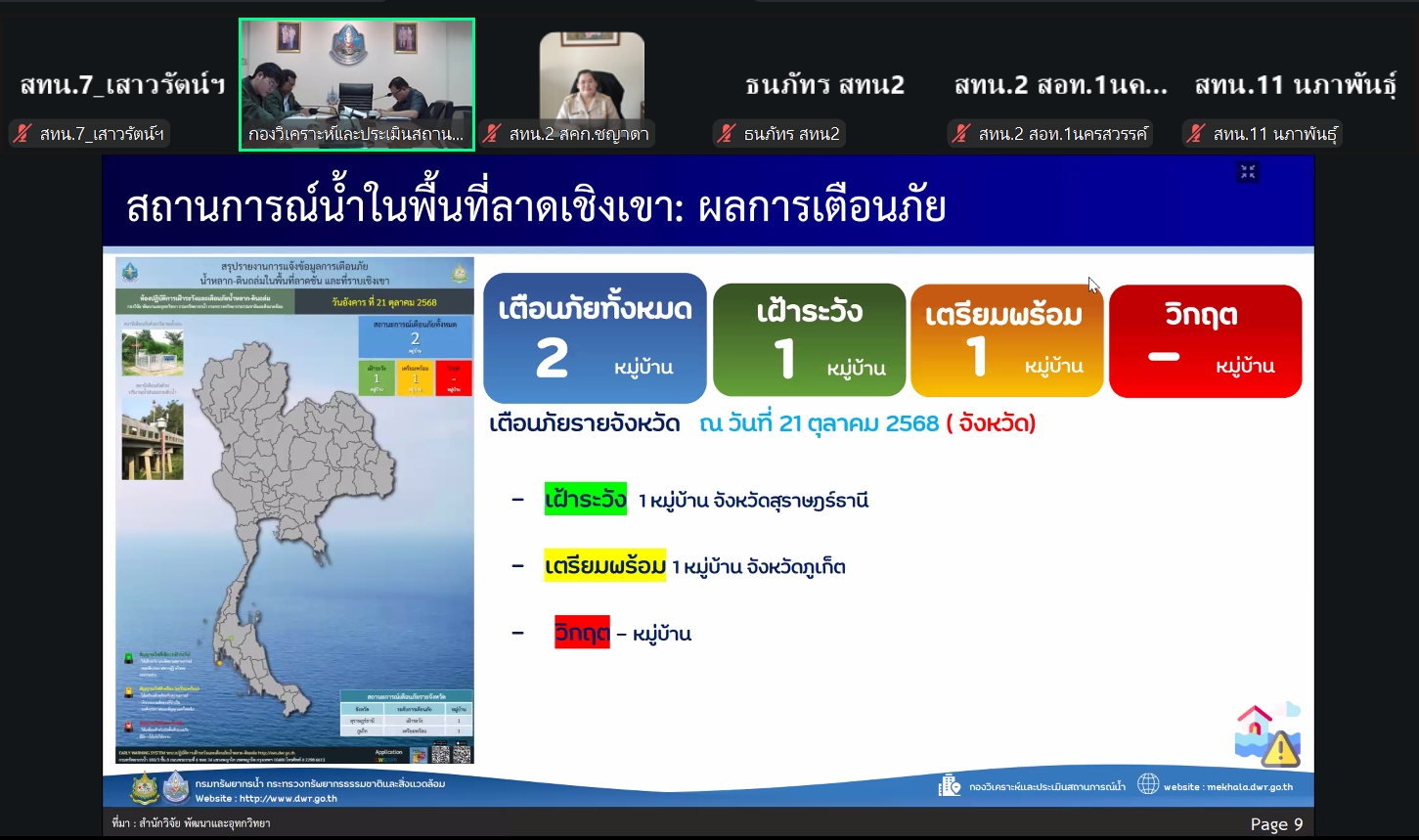 นายอนันต์ โพธิ์พันธุ์ ผู้อำนวยการสำนักงานทรัพยากรน้ำที่ 7 มอบหมายให้ ส่วนเครื่องกล และส่วนอุทกวิทยา เข้าร่วมประชุมคณะทำงานด้านการประเมินสถานการณ์น้ำและการบริหารจัดการน้ำ ครั้งที่ 24/2568 ผ่านสื่ออิเล็กทรอนิกส์ ระบบ ZOOM โดยมี นายธนากร แสนวงษ์ ผู้อำนวยการส่วนประสานการปฏิบัติงานในภาวะน้ำแล้ง เป็นประธานการประชุม เพื่อรายงานสถานการณ์น้ำ การเตรียมพร้อมรับมือและการให้ความช่วยเหลือพื้นที่ภัยแล้งและน้ำท่วม โดยส่วนเครื่องกล รายงานการให้ความช่วยเหลือพื้นที่ประสบปัญหาน้ำท่วม และพื้นที่ขาดแคลนน้ำใช้ในการอุปโภคบริโภคและการเกษตร รวมถึงการเตรียมความพร้อมอุปกรณ์ เครื่องมือ เครื่องจักร เพื่อรองรับภาวะน้ำแล้งและน้ำท่วม