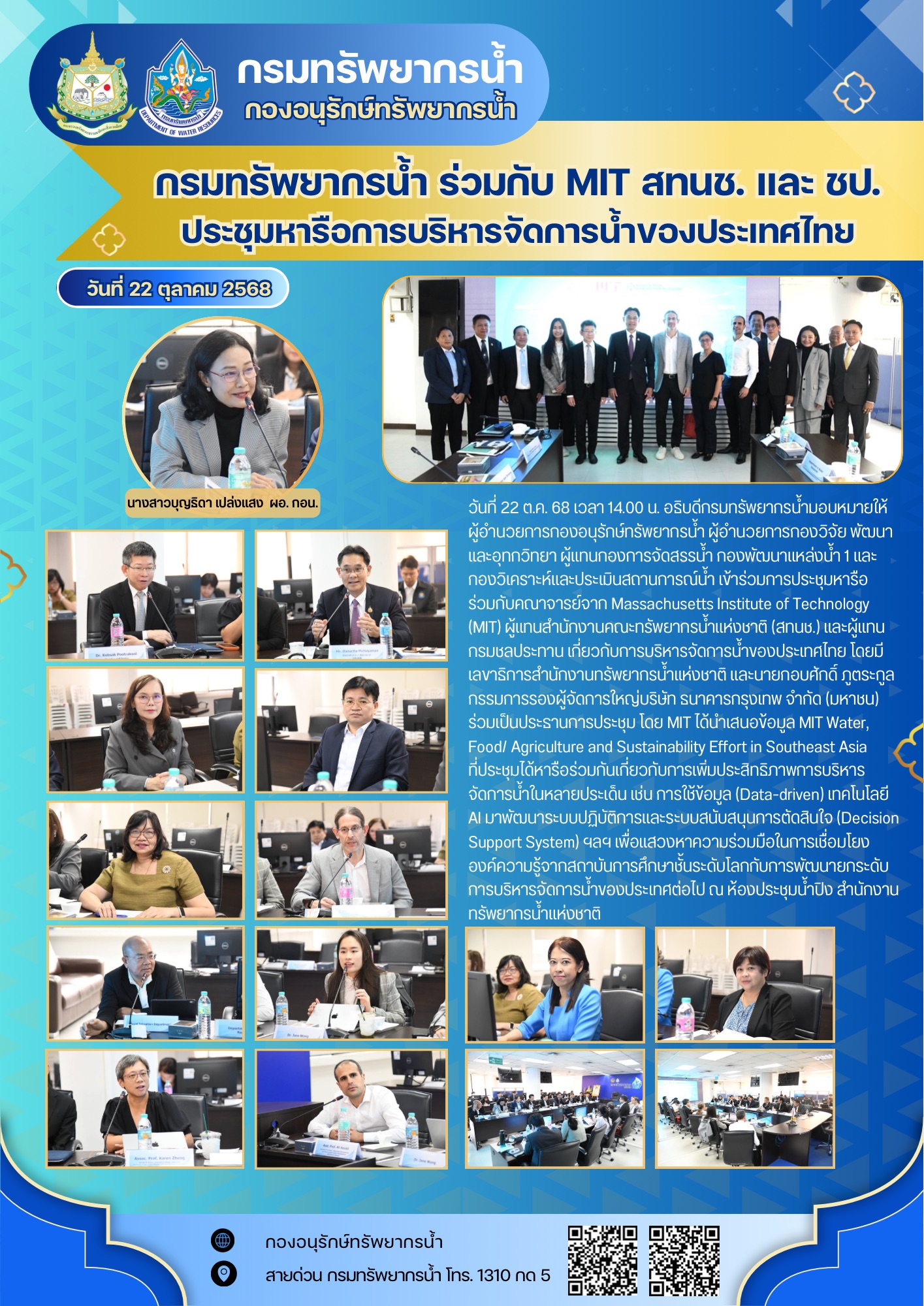 วันที่ 22 ต.ค. 68 เวลา 14.00 น. อธิบดีกรมทรัพยากรน้ำมอบหมายให้ผู้อำนวยการกองอนุรักษ์ทรัพยากรน้ำ ผู้อำนวยการกองวิจัย พัฒนาและอุทกวิทยา ผู้แทนกองการจัดสรรน้ำ กองพัฒนาแหล่งน้ำ 1 และกองวิเคราะห์และประเมินสถานการณ์น้ำ เข้าร่วมการประชุมหารือร่วมกับคณาจารย์จาก Massachusetts Institute of Technology (MIT) ผู้แทนสำนักงานคณะทรัพยากรน้ำแห่งชาติ และผู้แทนกรมชลประทาน เกี่ยวกับการบริหารจัดการน้ำของประเทศไทย โดยมีเลขาธิการสำนักงานทรัพยากรน้ำแห่งชาติ และนายกอบศักดิ์ ภูตระกูล กรรมการรองผู้จัดการใหญ่บริษัท ธนาคารกรุงเทพ จำกัด (มหาชน) ร่วมเป็นประธานการประชุม โดย MIT ได้นำเสนอข้อมูล MIT Water, Food/ Agriculture and Sustainability Effort in Southeast Asia ที่ประชุมได้หารือร่วมกันเกี่ยวกับการเพิ่มประสิทธิภาพการบริหารจัดการน้ำในหลายประเด็น เช่น การใช้ข้อมูล (Data-driven) เทคโนโลยี AI มาพัฒนาระบบปฏิบัติการและระบบสนับสนุนการตัดสินใจ (Decision Support System) ฯลฯ เพื่อแสวงหาความร่วมมือในการเชื่อมโยงองค์ความรู้จากสถาบันการศึกษาชั้นระดับโลกกับการพัฒนายกระดับการบริหารจัดการน้ำของประเทศต่อไป ณ ห้องประชุมน้ำปิง สำนักงานทรัพยากรน้ำแห่งชาติ