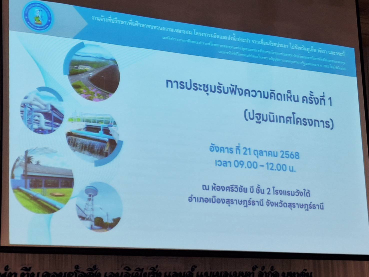 สำนักงานทรัพยากรน้ำที่ 10 โดยส่วนอนุรักษ์ทรัพยากรน้ำที่ 1 สุราษฎร์ธานี เข้าร่วมประชุมการมีส่วนร่วมของประชาชน ครั้งที่ 1 (ปฐมนิเทศโครงการ) โครงการผลิตและส่งน้ำประปาจากเขื่อนรัชชประภา ไปจังหวัดภูเก็ต พังงา และกระบี่ๆ โดยมีนายวิทศักดิ์ จำเริญนุสิต รองผู้ว่าราชการจังหวัดสุราษฎร์ธานี เป็นประธาน มีผู้เข้าร่วมประชุมประกอบด้วย ผู้มีส่วนได้เสียในพื้นที่ศึกษาโครงการ ผู้นำท้องถิ่น ผู้นำท้องที่องค์กรปกครองส่วนท้องถิ่นในพื้นที่ อ.พนม อ.บ้านตาขุน จ.สุราษฎร์ธานี และส่วนราชการที่เกี่ยวข้องในจังหวัด สุราษฎร์ธานี โดยมีวัตถุประสงค์ของการจัดประชุมฯ ครั้งนี้