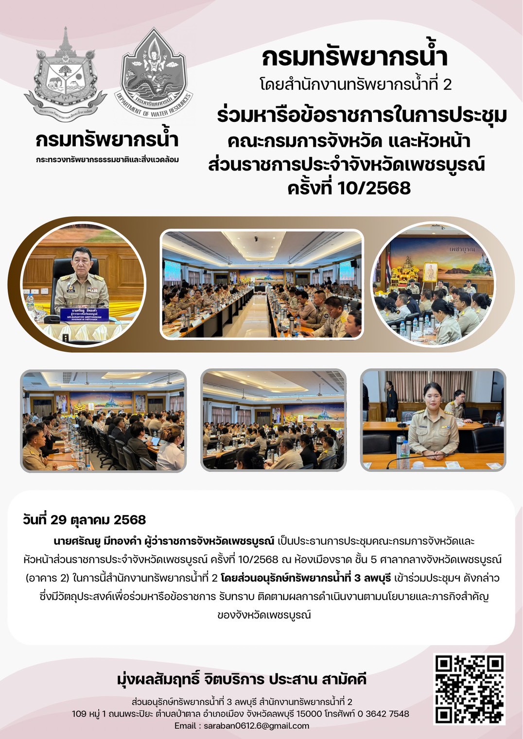 นายศรัณยู มีทองคำ ผู้ว่าราชการจังหวัดเพชรบูรณ์ เป็นประธานการประชุมคณะกรมการจังหวัดและหัวหน้าส่วนราชการประจำจังหวัดเพชรบูรณ์ ครั้งที่ 10/2568 ณ ห้องเมืองราด ชั้น 5 ศาลากลางจังหวัดเพชรบูรณ์ (อาคาร 2) ในการนี้สำนักงานทรัพยากรน้ำที่ 2 โดยส่วนอนุรักษ์ทรัพยากรน้ำที่ 3 ลพบุรี เข้าร่วมประชุมฯ ดังกล่าว ซึ่งมีวัตถุประสงค์เพื่อร่วมหารือข้อราชการ รับทราบ ติดตามผลการดำเนินงานตามนโยบายและภารกิจสำคัญของจังหวัดเพชรบูรณ์