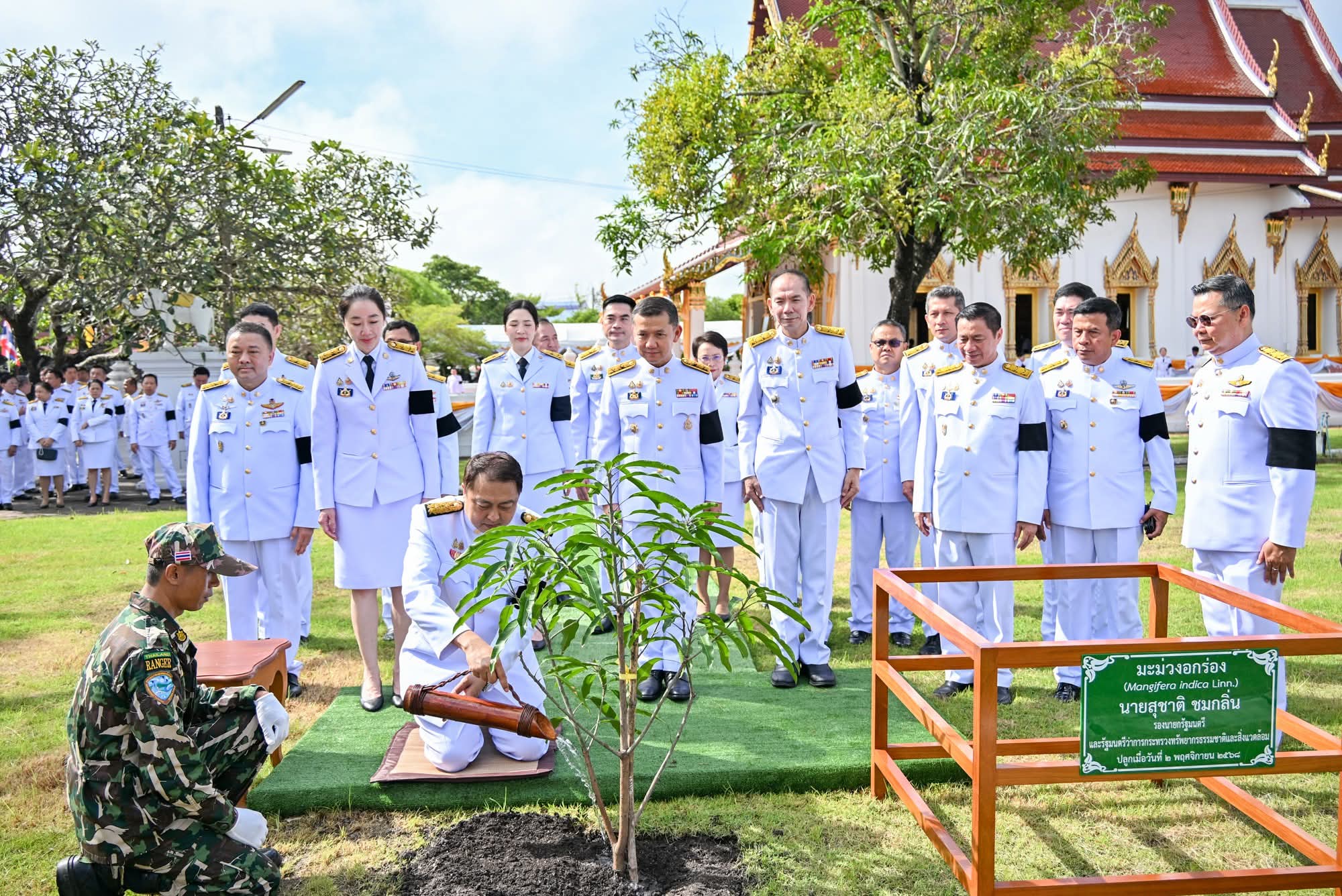 วันนี้ (2 พฤศจิกายน 2568) พระบาทสมเด็จพระเจ้าอยู่หัว ทรงพระกรุณาโปรดเกล้าฯ พระราชทานผ้าพระกฐินให้กระทรวงทรัพยากรธรรมชาติและสิ่งแวดล้อม น้อมนำไปถวายพระสงฆ์จำพรรษากาลถ้วนไตรมาส ณ วัดอัมพวันเจติยาราม อำเภออัมพวา จังหวัดสมุทรสงคราม นายสุชาติ ชมกลิ่น รองนายกรัฐมนตรีและรัฐมนตรีว่าการกระทรวงทรัพยากรธรรมชาติและสิ่งแวดล้อม เป็นประธานในพิธีถวายผ้าพระกฐินพระราชทาน กระทรวงทรัพยากรธรรมชาติและสิ่งแวดล้อม ประจำปีพุทธศักราช 2568 พร้อมด้วย ดร.ชญานันท์ ภักดีจิตต์ ปลัดกระทรวงฯ ผู้บริหารกระทรวงฯ และนายธีระชุณ บุญสิทธิ์ อธิบดีกรมทรัพยากรน้ำ ประจำปีพุทธศักราช 2568 ในการนี้ นายสุชาติ ชมกลิ่น รองนายกรัฐมนตรีฯ ได้สักการะ พระบรมราชาอนุสาวรีย์พระบาทสมเด็จพระพุทธเลิศหล้านภาลัย (รัชกาลที่ 2) ถวายจตุปัจจัยและเครื่องไทยธรรม ทำนุบำรุงวัดอัมพวันเจติยาราม สมทบเป็นทุนการศึกษาให้แก่ โรงเรียนอัมพวันวิทยาลัย และโรงเรียนเทศบาล 3 วัดอัมพวันเจติยาราม และปลูกต้นมะม่วงอกร่อง เพื่อส่งเสริมการเพิ่มพื้นที่สีเขียวและการอนุรักษ์ทรัพยากรธรรมชาติและสิ่งแวดล้อม