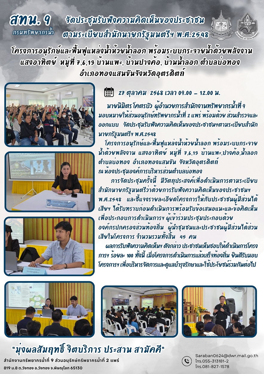 นายนิมิตร โคตรบัว ผู้อำนวยการสำนักงานทรัพยากรน้ำที่ 9 มอบหมายให้ส่วนอนุรักษ์ทรัพยากรน้ำที่ 2 แพร่ พร้อมด้วย ส่วนสำรวจและออกแบบ จัดประชุมรับฟังความคิดเห็นของประชาชนฯตามระเบียบสำนักนายกรัฐมนตรีฯ พ.ศ.2548