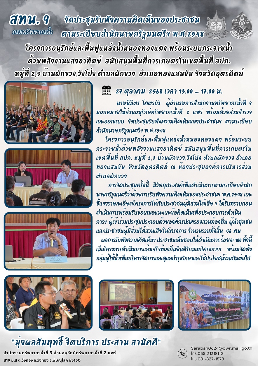 นายนิมิตร โคตรบัว ผู้อำนวยการสำนักงานทรัพยากรน้ำที่ 9 มอบหมายให้ส่วนอนุรักษ์ทรัพยากรน้ำที่ 2 แพร่ พร้อมด้วยส่วนสำรวจและออกแบบ จัดประชุมรับฟังความคิดเห็นของประชาชนฯ ตามระเบียบสำนักนายกรัฐมนตรีฯ พ.ศ.2548