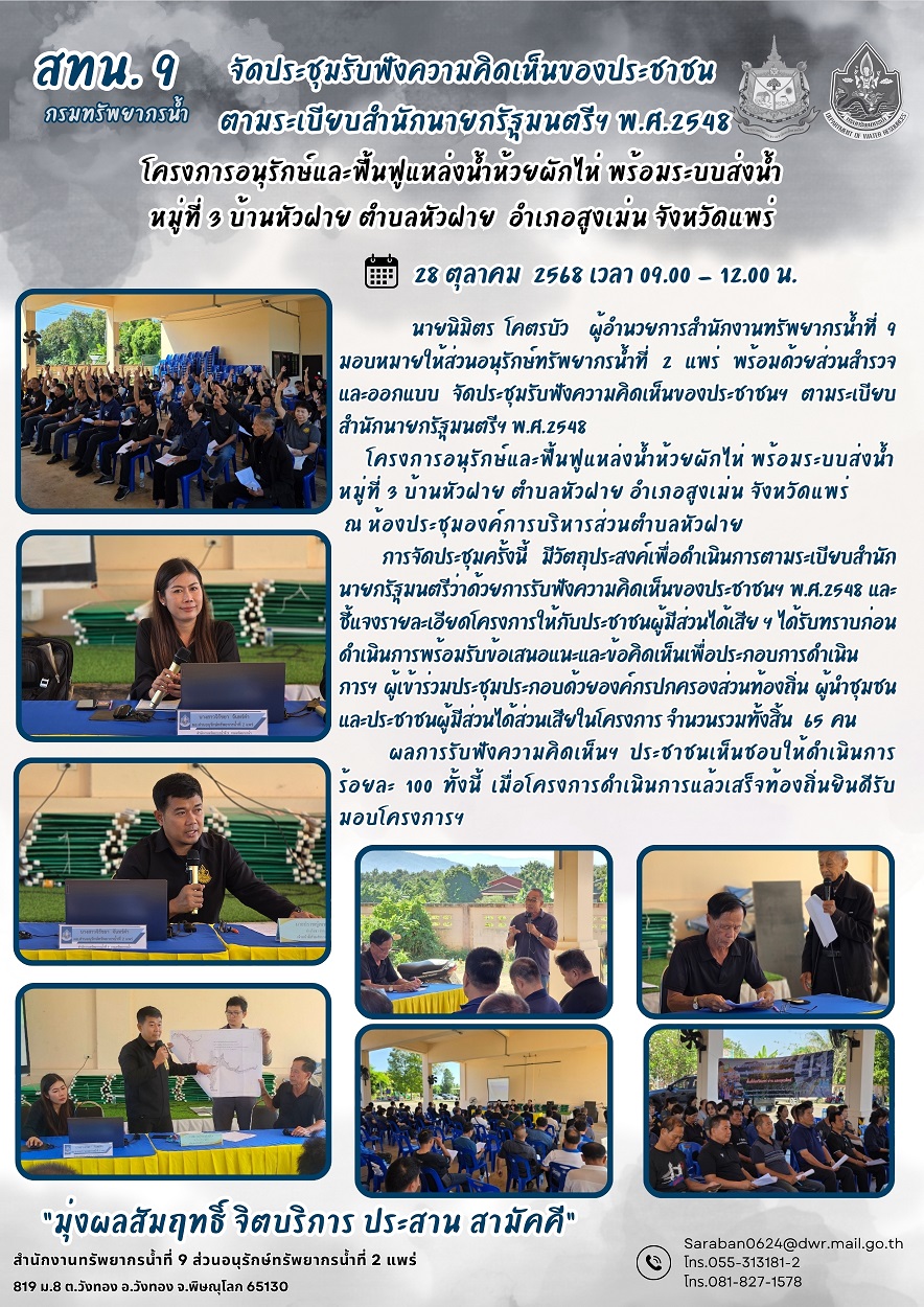 นายนิมิตร โคตรบัว ผู้อำนวยการสำนักงานทรัพยากรน้ำที่ 9 มอบหมายให้ส่วนอนุรักษ์ทรัพยากรน้ำที่ 2 แพร่ พร้อมด้วยส่วนสำรวจและออกแบบ จัดประชุมรับฟังความคิดเห็นของประชาชนฯ ตามระเบียบสำนักนายกรัฐมนตรีฯ พ.ศ.2548