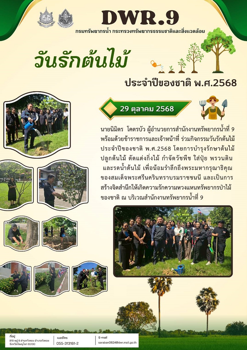 29 ตุลาคม 2568 นายนิมิตร โคตรบัว ผู้อำนวยการสำนักงานทรัพยากรน้ำที่ 9 พร้อมด้วยข้าราชการและเจ้าหน้าที่ ร่วมกิจกรรมวันรักต้นไม้ ประจำปีของชาติ พ.ศ.2568 โดยการบำรุงรักษาต้นไม้ ปลูกต้นไม้ ตัดแต่งกิ่ง กำจัดวัชพืช ใส่ปุ๋ย พรวนดินและรดน้ำต้นไม้ เพื่อน้อมรำลึกถึงพระมหากรุณาธิคุณของสมเด็จพระศรีนครินทราบรมราชชนนี และเป็นการสร้างจิตสำนึกให้เกิดความรักความหวงแหนทรัพยากรป่าไม้ของชาติ ณ บริเวณสำนักงานทรัพยากรน้ำที่ 9