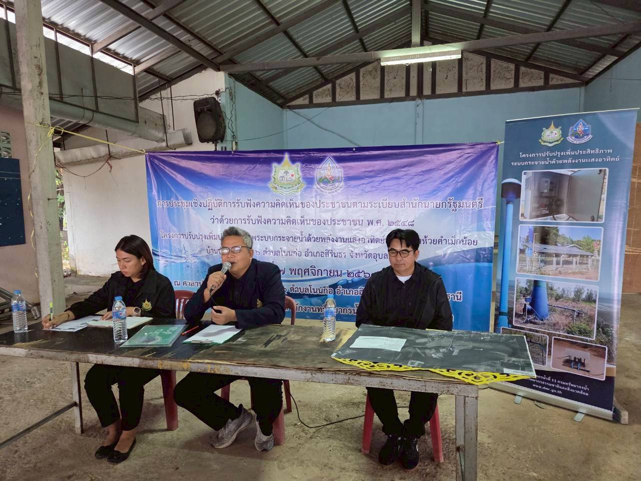 วันที่ 7 พฤศจิกายน 2568 นายโภคิน ช้ำเกตุ ผู้อำนวยการสำนักงานทรัพยากรน้ำที่ 11 มอบหมายให้เจ้าหน้าที่ส่วนอนุรักษ์ทรัพยากรน้ำลงพื้นที่เพื่อจัดประชุมเชิงปฏิบัติการ รับฟังความคิดเห็นของประชาชนตามระเบียบสำนักนายกรัฐมนตรีว่าด้วยการรับฟัง ความคิดเห็นของประชาชน พ.ศ. 2548 “โครงการปรับปรุงเพิ่มประสิทธิภาพระบบกระจายน้ำ ด้วยพลังงานแสงอาทิตย์อ่างเก็บน้ำห้วยคำเม็กน้อย” บ้านป่าเลา หมู่ที่ 6 ตำบลโนนก่อ อำเภอสิรินธร จังหวัดอุบลราชธานี ณ ศาลาประชาคมบ้านป่าเลา หมู่ที่ 6 มีประชาชนในพื้นที่ เข้ารับฟังโครงการฯ จำนวน 33 ราย ทั้งนี้ ได้มีการชี้แจงรายละเอียดเกี่ยวกับโครงการ ของกรมทรัพยากรน้ำที่จะเข้ามาดำเนินการในพื้นที่ ซึ่งที่ประชุมฯ มีมติเห็นชอบ ให้ดำเนินโครงการฯและให้ข้อคิดเห็นข้อเสนอแนะที่เป็นประโยชน์โดยสำนักงานทรัพยากรน้ำ ที่ 11 จะนำข้อเสนอแนะและความต้องการของที่ประชุมไปพิจารณาดำเนินการเพื่อขอรับ การสนับสนุนงบประมาณการก่อสร้างโครงการต่อไป