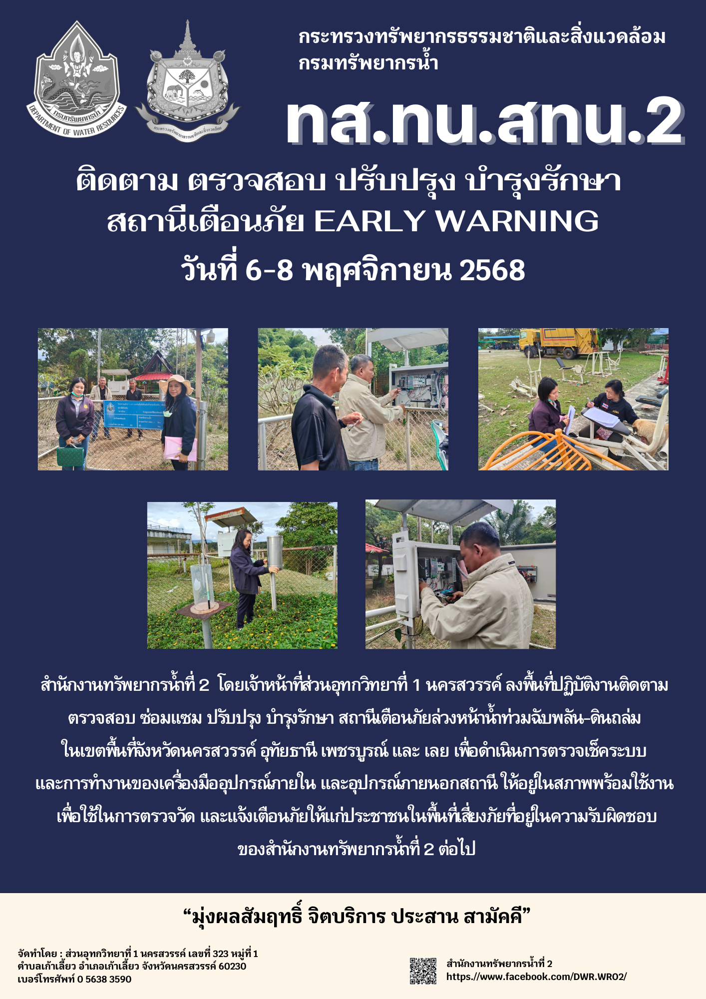วันที่ 6-8 พฤศจิกายน 2568 สำนักงานทรัพยากรน้ำที่ 2 โดยเจ้าหน้าที่ส่วนอุทกวิทยาที่ 1 นครสวรรค์ ลงพื้นที่ปฏิบัติงานติดตาม ตรวจสอบ ซ่อมแซม ปรับปรุง บำรุงรักษา สถานีเตือนภัยล่วงหน้าน้ำท่วมฉับพลัน-ดินถล่ม
