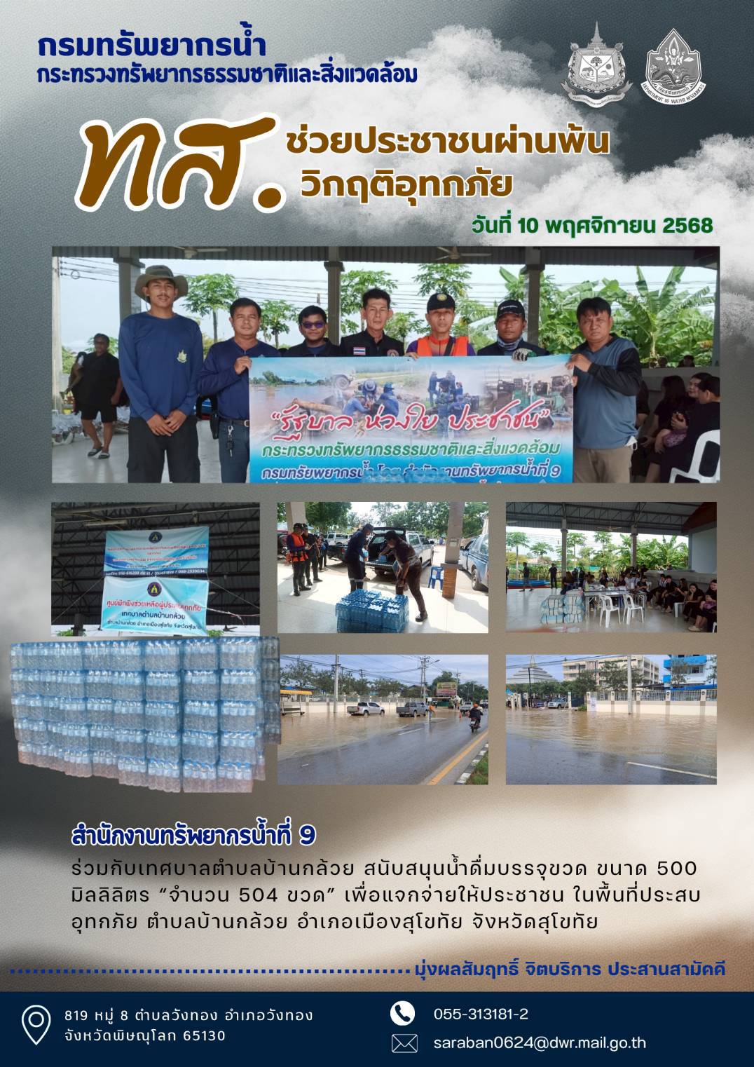 วันที่ 10 พฤศจิกายน 2568 สำนักงานทรัพยากรน้ำที่ 9 ร่วมกับเทศบาลตำบลบ้านกล้วย สนับสนุนน้ำดื่มบรรจุขวด ขนาด 500 มิลลิลิตร “จำนวน 504 ขวด” เพื่อแจกจ่ายให้ประชาชน ในพื้นที่ประสบอุทกภัย ตำบลบ้านกล้วย อำเภอเมืองสุโขทัย จังหวัดสุโขทัย