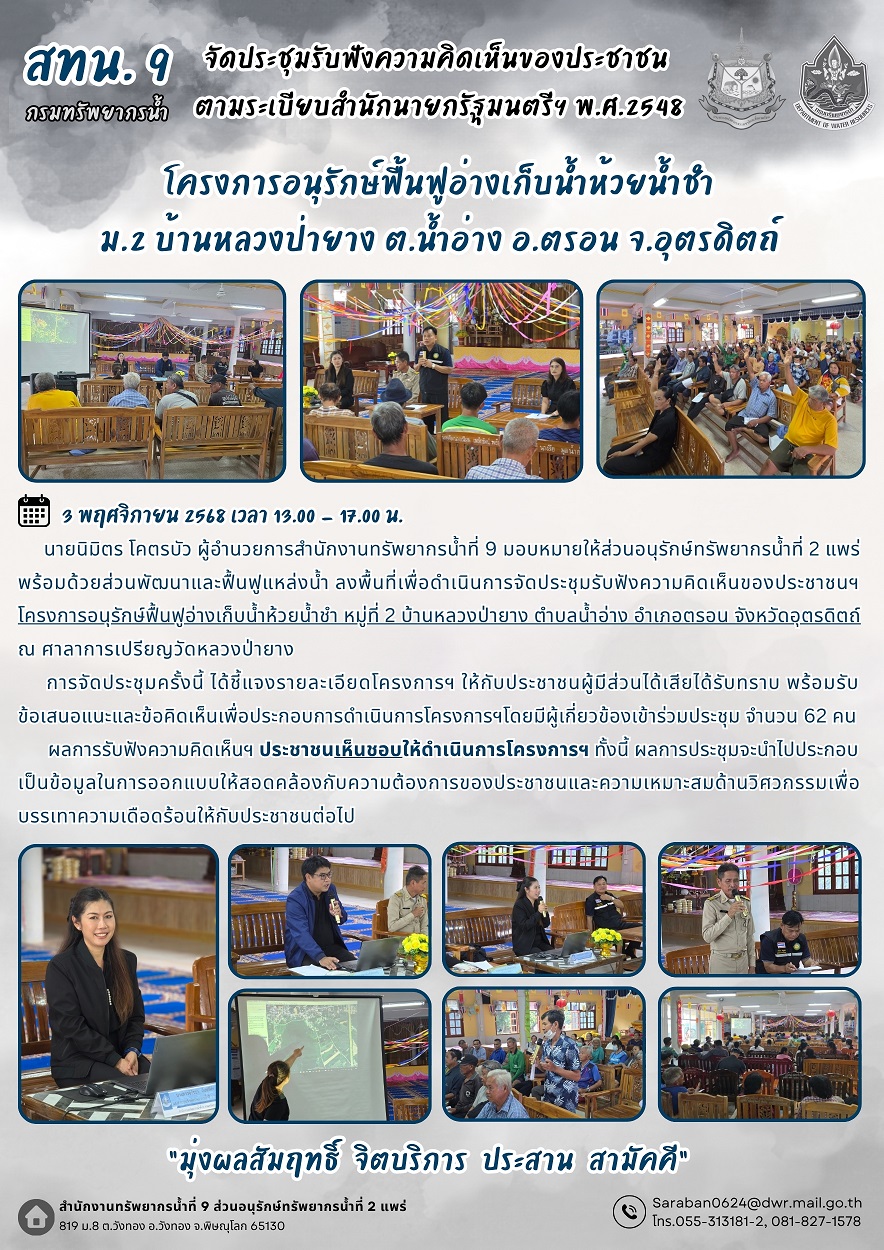 นายนิมิตร โคตรบัว ผู้อำนวยการสำนักงานทรัพยากรน้ำที่ 9 มอบหมายให้ส่วนอนุรักษ์ทรัพยากรน้ำที่ 2 แพร่ พร้อมด้วยส่วนพัฒนาและฟื้นฟูแหล่งน้ำ จัดประชุมรับฟังความคิดเห็นของประชาชนฯ โครงการอนุรักษ์ฟื้นฟูอ่างเก็บน้ำห้วยน้ำชำ หมู่ที่ 2 บ้านหลวงป่ายาง ตำบลน้ำอ่าง อำเภอตรอน จังหวัดอุตรดิตถ์ ณ ศาลาการเปรียญวัดหลวงป่ายาง หมู่ที่ 2