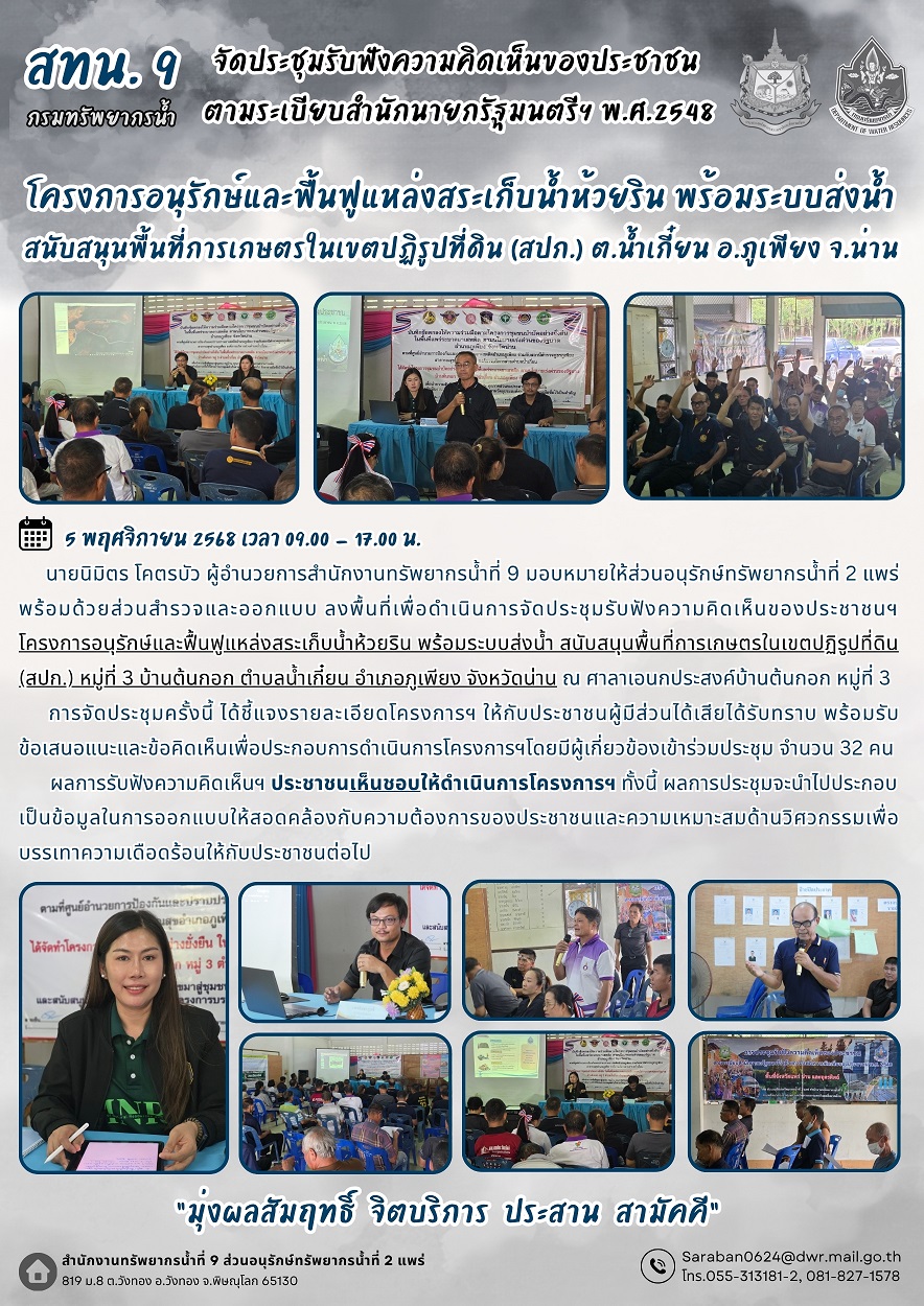 นายนิมิตร โคตรบัว ผู้อำนวยการสำนักงานทรัพยากรน้ำที่ 9 มอบหมายให้ส่วนอนุรักษ์ทรัพยากรน้ำที่ 2 แพร่ พร้อมด้วยส่วนสำรวจและออกแบบ จัดประชุมรับฟังความคิดเห็นของประชาชนฯ โครงการอนุรักษ์และฟื้นฟูแหล่งสระเก็บน้ำห้วยริน พร้อมระบบส่งน้ำ สนับสนุนพื้นที่การเกษตรในเขตปฏิรูปที่ดิน (สปก.) หมู่ที่ 3 บ้านต้นกอก ตำบลน้ำเกี๋ยน อำเภอภูเพียง จังหวัดน่าน ณ ศาลาเอนกประสงค์บ้านต้นกอก หมู่ที่ 3
