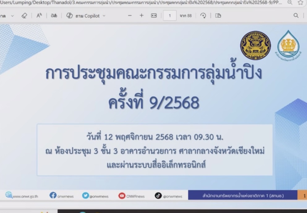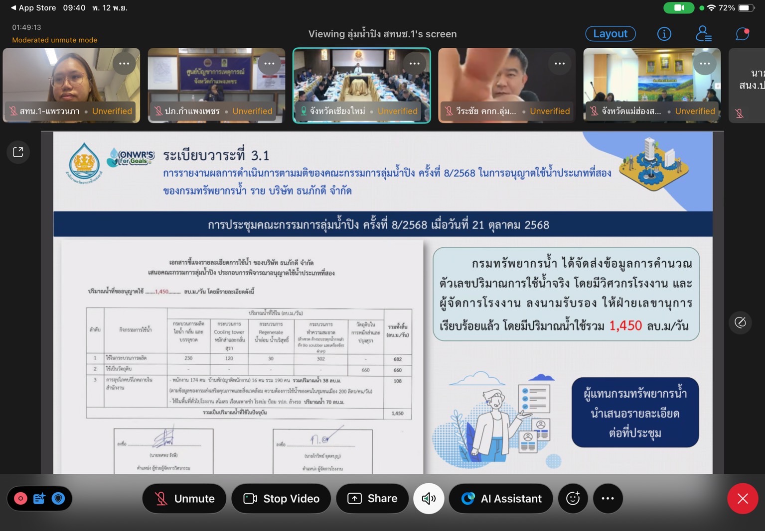 นางสาวสุพัดสอน สีมืด ผู้อำนวยการสำนักงานทรัพยากรน้ำที่ 1 มอบหมายให้นายศิริศักดิ์ เกษารัตน์ ผู้อำนวยการส่วนการจัดสรรน้ำที่ 1 ลำปาง พร้อมเจ้าหน้าที่ เข้าร่วมประชุมคณะกรรมการลุ่มน้ำปิง ครั้งที่ 9/2568 ผ่านสื่ออิเล็กทรอนิกส์ Webex Meeting โดยมี นายศิวกร บัวป้อง รองผู้ว่าราชการจังหวัดเชียงใหม่ เป็นประธานการประชุม ซึ่งมีวาระการประชุมเรื่องสืบเนื่องที่เกี่ยวข้องกับกรมทรัพยากรน้ำในการขออนุญาตใช้น้ำประเภทที่สอง ของบริษัท ธนภักดี จำกัด โดยตามมติที่ประชุมคณะกรรมการลุ่มน้ำปิง ครั้งที่ 8/2568 เมื่อวันที่ 21 ตุลาคม 2568 คณะกรรมการฯ ได้เห็นชอบในหลักการคำขออนุญาตการใช้น้ำและให้จัดทำข้อมูลปริมาณน้ำที่ใช้จริงต่อวัน เสนอต่อคณะกรรมการฯ เพิ่มเติม