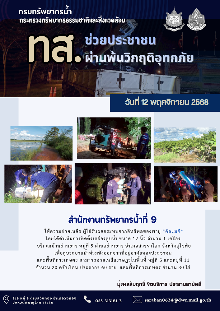 สำนักงานทรัพยากรน้ำที่ 9 ให้ความช่วยเหลือ ผู้ได้รับผลกระทบจากอิทธิพลของพายุ “คัลแมกี”