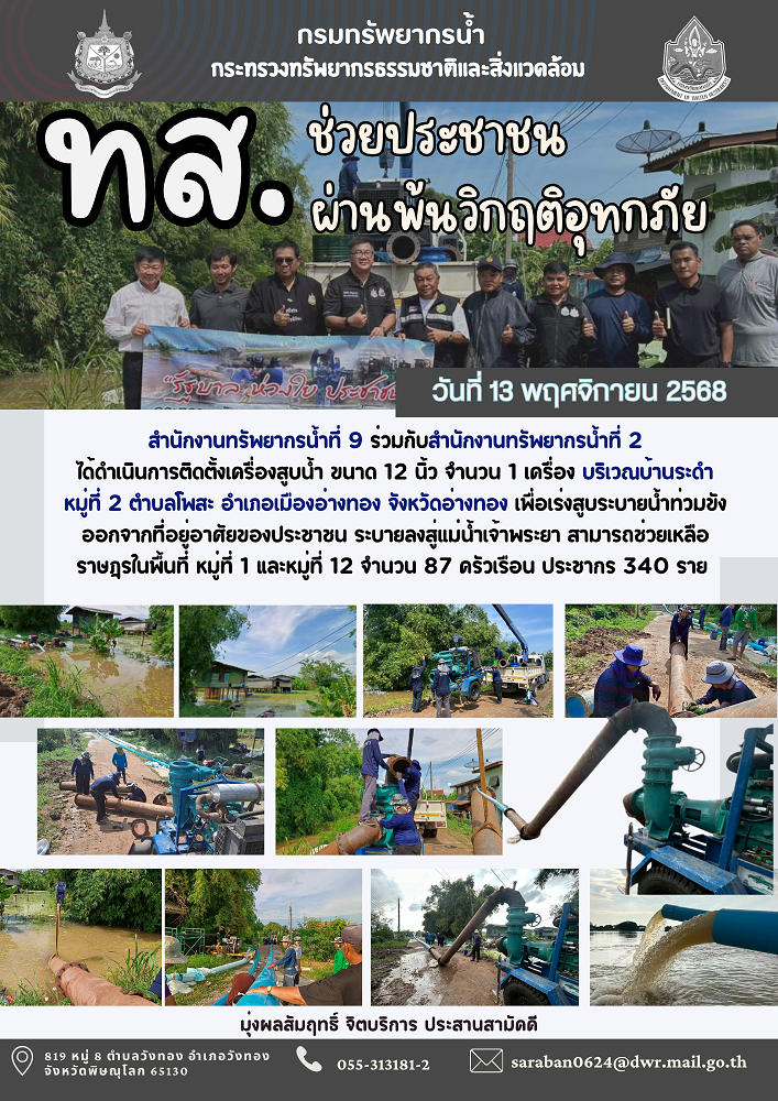 สำนักงานทรัพยากรน้ำที่ 9 ร่วมกับสำนักงานทรัพยากรน้ำที่ 2 ได้ดำเนินการติดตั้งเครื่องสูบน้ำ ขนาด 12 นิ้ว จำนวน 1 เครื่อง บริเวณบ้านระดำ หมู่ที่ 2 ตำบลโพสะ อำเภอเมืองอ่างทอง จังหวัดอ่างทอง เพื่อเร่งสูบระบายน้ำท่วมขังออกจากที่อยู่อาศัยของประชาชน ระบายลงสู่แม่น้ำเจ้าพระยา สามารถช่วยเหลือราษฎรในพื้นที่ หมู่ที่ 1 และหมู่ที่ 12 จำนวน 87 ครัวเรือน ประชากร 340 ราย