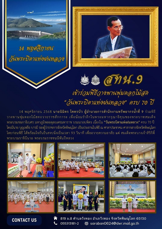 14 พฤศจิกายน 2568 นายนิมิตร โคตรบัว ผู้อำนวยการสำนักงานทรัพยากรน้ำที่ 9 ร่วมพิธีวางพานพุ่มดอกไม้สดถวายราชสักการะ เพื่อน้อมรำลึกในพระมหากรุณาธิคุณของพระบาทสมเด็จพระบรมชนกาธิเบศร มหาภูมิพลอดุลยเดชมหาราช บรมนาถบพิตร เนื่องใน "วันพระบิดาแห่งฝนหลวง" ครบ 70 ปีโดยมีนาย บุญเหลือ บารมี รองผู้ว่าราชการจังหวัดพิษณุโลก เป็นประธานในพิธี ณ ศาลาประชาคม ศาลากลางจังหวัดพิษณุโลก โดยก่อนพิธี ได้พร้อมใจกันยืนสงบนิ่งเป็นเวลา 93 วินาที เพื่อถวายความอาลัย แด่ สมเด็จพระนางเจ้าสิริกิติ์ พระบรมราชินีนาถ พระบรมราชชนนีพันปีหลวง