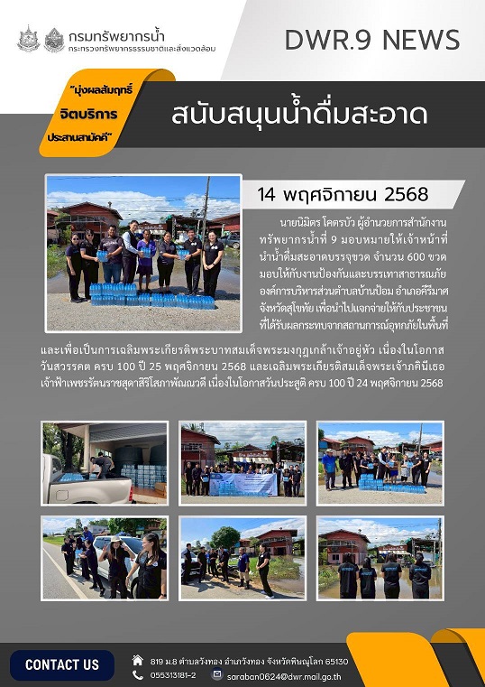 นายนิมิตร โคตรบัว ผู้อำนวยการสำนักงานทรัพยากรน้ำที่ 9 มอบหมายให้เจ้าหน้าที่นำน้ำดื่มสะอาดบรรจุขวด จำนวน 600 ขวดมอบให้กับงานป้องกันและบรรเทาสาธารณภัยองค์การบริหารส่วนตำบลบ้านป้อม อำเภอคีรีมาศ จังหวัดสุโขทัย เพื่อนำไปแจกจ่ายให้กับประชาชน ที่ได้รับผลกระทบจากสถานการณ์อุทกภัยในพื้นที่และเพื่อเป็นการเฉลิมพระเกียรติพระบาทสมเด็จพระมงกุฎเกล้าเจ้าอยู่หัว เนื่องในโอกาสวันสวรรคต ครบ 100 ปี 25 พฤศจิกายน 2568 และเฉลิมพระเกียรติสมเด็จพระเจ้าภคินีเธอ เจ้าฟ้าเพชรรัตนราชสุดาสิริโสภาพัณณวดี เนื่องในโอกาสวันประสูติ ครบ 100 ปี 24 พฤศจิกายน 2568