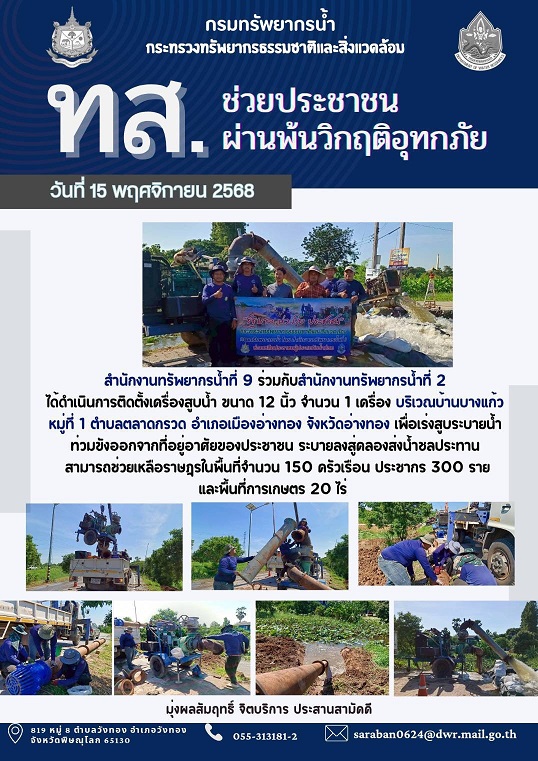สำนักงานทรัพยากรน้ำที่ 9 ร่วมกับสำนักงานทรัพยากรน้ำที่ 2 ได้ดำเนินการติดตั้งเครื่องสูบน้ำ ขนาด 12 นิ้ว จำนวน 1 เครื่อง บริเวณบ้านบางแก้ว หมู่ที่ 1 ตำบลตลาดกรวด อำเภอเมืองอ่างทอง จังหวัดอ่างทอง เพื่อเร่งสูบระบายน้ำท่วมขังออกจากที่อยู่อาศัยของประชาชนระบายลงสู่คลองส่งน้ำชลประทานสามารถช่วยเหลือราษฎรในพื้นที่จำนวน 150 ครัวเรือน ประชากร 300 รายและพื้นที่การเกษตร 20 ไร่