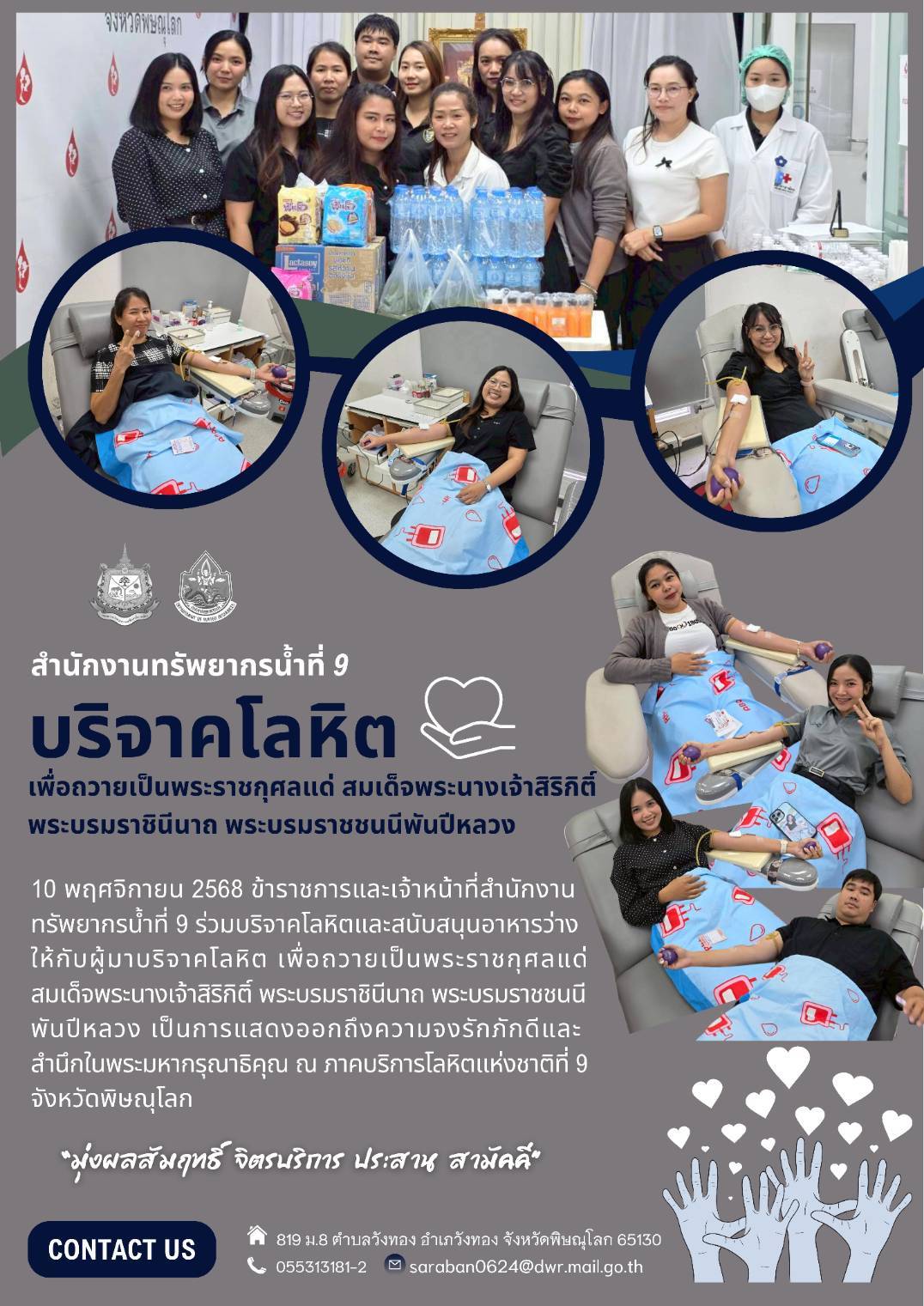 วันที่ 10 พฤศจิกายน 2568 ข้าราชการและเจ้าหน้าที่สำนักงานทรัพยากรน้ำที่ 9 ร่วมบริจาคโลหิตและสนับสนุนอาหารว่างให้กับผู้มาบริจาคโลหิต เพื่อถวายเป็นพระราชกุศลแด่สมเด็จพระนางเจ้าสิริกิติ์ พระบรมราชินีนาถ พระบรมราชชนนีพันปีหลวง เป็นการแสดงออกถึงความจงรักภักดีและสำนึกในพระมหากรุณาธิคุณ ณ ภาคบริการโลหิตแห่งชาติที่ 9 จังหวัดพิษณุโลก