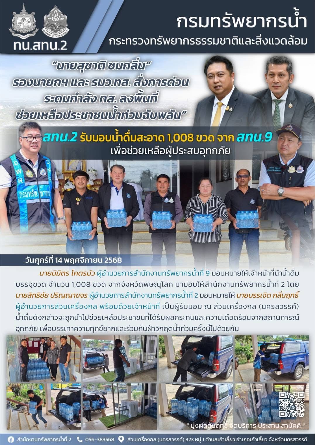 นายนิมิตร โคตรบัว ผู้อำนวยการสำนักงานทรัพยากรน้ำที่ 9 มอบหมายให้เจ้าหน้าที่นำน้ำดื่มบรรจุขวด จำนวน 1,008 ขวด จากจังหวัดพิษณุโลก มามอบให้สำนักงานทรัพยากรน้ำที่ 2 โดย นายสิทธิชัย ปริญญาขจร ผู้อำนวยการสำนักงานทรัพยากรน้ำที่ 2 มอบหมายให้ นายบรรเจิด กลิ่นฤทธิ์ ผู้อำนวยการส่วนเครื่องกล พร้อมด้วยเจ้าหน้าที่เป็นผู้รับมอบ ณ ส่วนเครื่องกล (นครสวรรค์) น้ำดื่มดังกล่าวจะถูกนำไปช่วยเหลือประชาชนที่ได้รับผลกระทบและความเดือดร้อนจากสถานการณ์อุทกภัย เพื่อบรรเทาความทุกข์ยากและร่วมกันฝ่าวิกฤตน้ำท่วมครั้งนี้ไปด้วยกัน