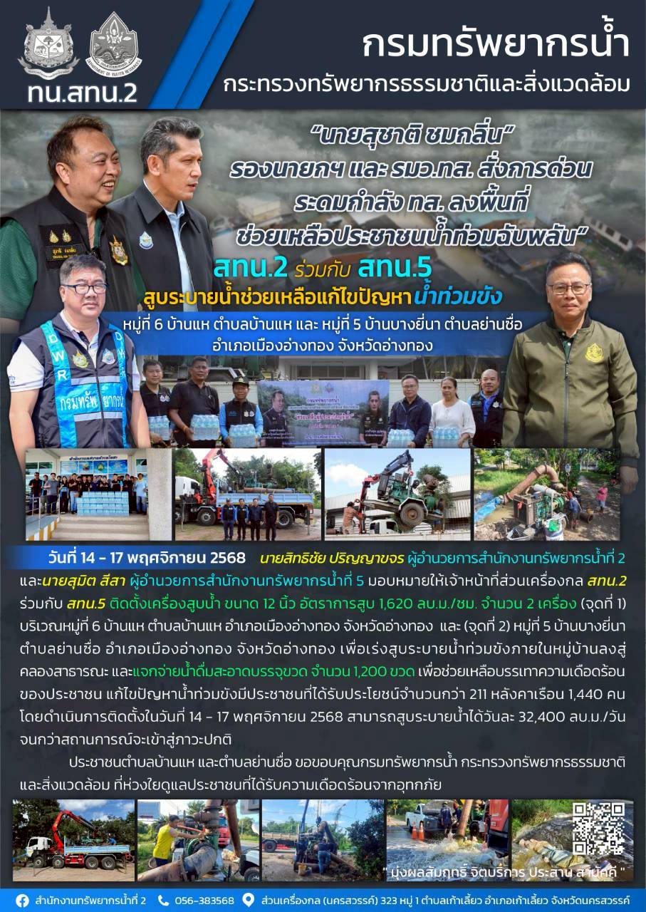 นายสิทธิชัย ปริญญาขจร ผู้อำนวยการสำนักงานทรัพยากรน้ำที่ 2 และนายสุมิต สีสา ผู้อำนวยการสำนักงานทรัพยากรน้ำที่ 5 มอบหมายให้เจ้าหน้าที่ส่วนเครื่องกล สทน.2 ร่วมกับ สทน.5 ติดตั้งเครื่องสูบน้ำขนาด 12 นิ้ว อัตราการสูบ 1,620 ลบ.ม./ชม. จำนวน 2 เครื่อง (จุดที่ 1) บริเวณหมู่ที่ 6 บ้านแห ตำบลบ้านแห อำเภอเมืองอ่างทอง จังหวัดอ่างทอง และ (จุดที่ 2) หมู่ที่ 5 บ้านบางยี่นา ตำบลย่านซื่อ อำเภอเมืองอ่างทอง จังหวัดอ่างทอง เพื่อเร่งสูบระบายน้ำท่วมขังภายในหมู่บ้านลงสู่คลองสาธารณะและแจกจ่ายน้ำดื่มสะอาดบรรจุขวด จำนวน 1,200 ขวด เพื่อช่วยเหลือบรรเทาความเดือดร้อนของประชาชน แก้ไขปัญหาน้ำท่วมขัง มีประชาชนที่ได้รับประโยชน์จำนวนกว่า 211 หลังคาเรือน 1,440 คน โดยดำเนินการติดตั้งในวันที่ 14 และ 16 พฤศจิกายน 2568 สามารถสูบระบายน้ำได้วันละ 32,400 ลบ.ม./วัน จนกว่าสถานการณ์จะเข้าสู่ภาวะปกติ