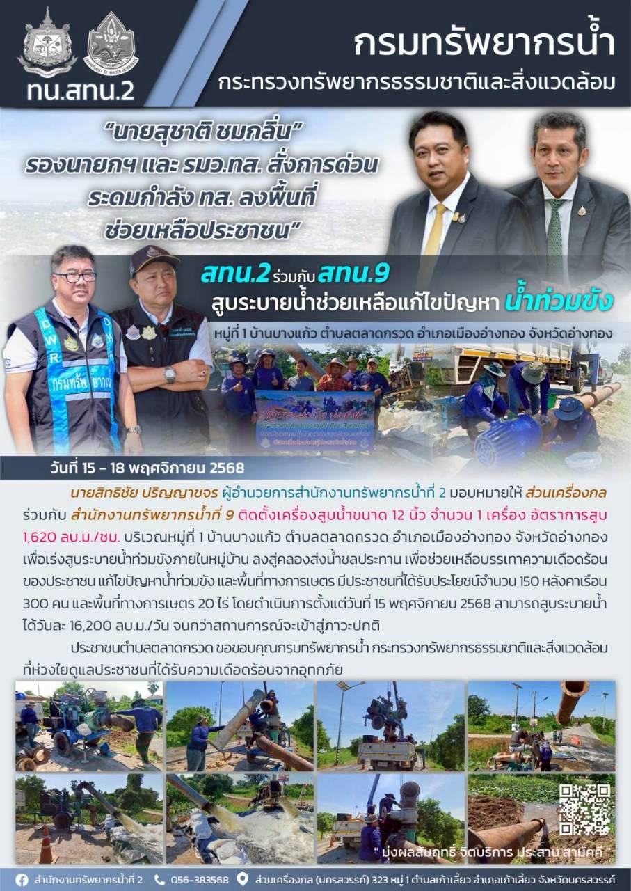 นายสิทธิชัย ปริญญาขจร ผู้อำนวยการสำนักงานทรัพยากรน้ำที่ 2 มอบหมายให้ ส่วนเครื่องกล ร่วมกับสำนักงานทรัพยากรน้ำที่ 9 ติดตั้งเครื่องสูบน้ำขนาด 12 นิ้ว จำนวน 1 เครื่อง อัตราการสูบ 1,620 ลบ.ม./ชม. บริเวณหมู่ที่ 1 บ้านบางแก้ว ตำบลตลาดกรวด อำเภอเมืองอ่างทอง จังหวัดอ่างทอง เพื่อเร่งสูบระบายน้ำท่วมขังภายในหมู่บ้านลงสู่คลองส่งน้ำชลประทาน เพื่อช่วยเหลือบรรเทาความเดือดร้อนของประชาชน แก้ไขปัญหาน้ำท่วมขัง และพื้นที่ทางการเษตร มีประชาชนที่ได้รับประโยชน์จำนวน 150 หลังคาเรือน 300 คน และพื้นที่ทางการเษตร 20 ไร่ โดยดำเนินการตั้งแต่วันที่ 15 พฤศจิกายน 2568 สามารถสูบระบายน้ำได้วันละ 16,200 ลบ.ม./วัน จนกว่าสถานการณ์จะเข้าสู่ภาวะปกติ
