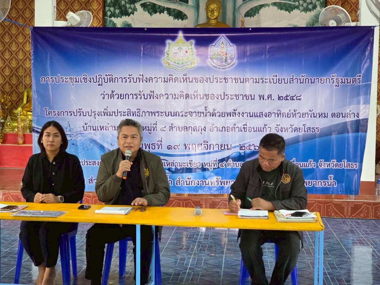 วันที่ 19 พฤศจิกายน 2568 นายโภคิน ช้ำเกตุ ผู้อำนวยการสำนักงานทรัพยากรน้ำที่ 11 มอบหมายให้เจ้าหน้าที่ส่วนอนุรักษ์ทรัพยากรน้ำลงพื้นที่เพื่อจัดประชุมเชิงปฏิบัติการ รับฟังความคิดเห็นของประชาชนตามระเบียบสำนักนายกรัฐมนตรีว่าด้วยการรับฟัง ความคิดเห็นของประชาชน พ.ศ. 2548 “โครงการปรับปรุงเพิ่มประสิทธิภาพระบบกระจายน้ำ ด้วยพลังงานแสงอาทิตย์ห้วยพันหม ตอนล่าง” บ้านเหล่ามะเขียว หมู่ที่ 4 ตำบลกุดกุง อำเภอคำเขื่อนแก้ว จังหวัดยโสธร ณ ศาลาอเนกประสงค์วัดเหล่ามะเขียว บ้านเหล่ามะเขียว หมู่ที่ 4 มีประชาชนในพื้นที่เข้ารับฟังโครงการฯ จำนวน 62 ราย ทั้งนี้ ได้มีการชี้แจง รายละเอียดเกี่ยวกับโครงการของกรมทรัพยากรน้ำที่จะเข้ามาดำเนินการในพื้นที่ ซึ่งที่ประชุมฯ มีมติเห็นชอบ ให้ดำเนินโครงการฯ และให้ข้อคิดเห็นข้อเสนอแนะที่เป็น ประโยชน์โดยสำนักงานทรัพยากรน้ำที่ 11 จะนำข้อเสนอแนะและความต้องการของที่ ประชุมไปพิจารณาดำเนินการเพื่อขอรับการสนับสนุนงบประมาณการก่อสร้างโครงการต่อไป