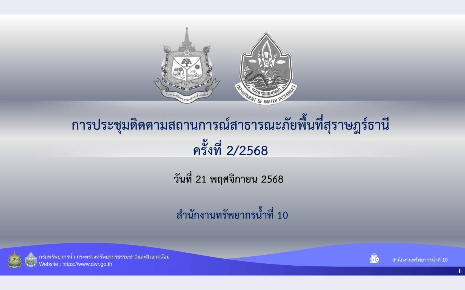 สำนักงานทรัพยากรน้ำที่ 10 โดย ผู้อำนวยการส่วนอุทกวิทยาที่ 1 สุราษฎร์ธานี ได้เข้าร่วมประชุมติดตามสถานการณ์สาธารณภัย ครั้งที่ 2 /2568 ณ ศาลากลางจังหวัดสุราษฎร์ธานี ซึ่งมี หัวหน้าส่วนราชการ นายอำเภอ องค์กรปกครองส่วนท้องถิ่น และหน่วยงานที่เกี่ยวข้อง เข้าร่วมประชุมในครั้งนี้ โดย นายจุมพฏ วรรณฉัตรสิริ ผู้ว่าราชการจังหวัดสุราษฎร์ธานี เป็นประธานการประชุม ทั้งนี้ได้มอบให้สำนักงานทรัพยากรน้ำที่ 10 ติดตั้งเครื่องสูบน้ำ เพื่อเร่งระบายน้ำออกจากเรือนจำอำเภอไชยา จังหวัดสุราษฎร์ธานี จนกว่าสถานการณ์น้ำจะกลับมาสู่ภาวะปกติ