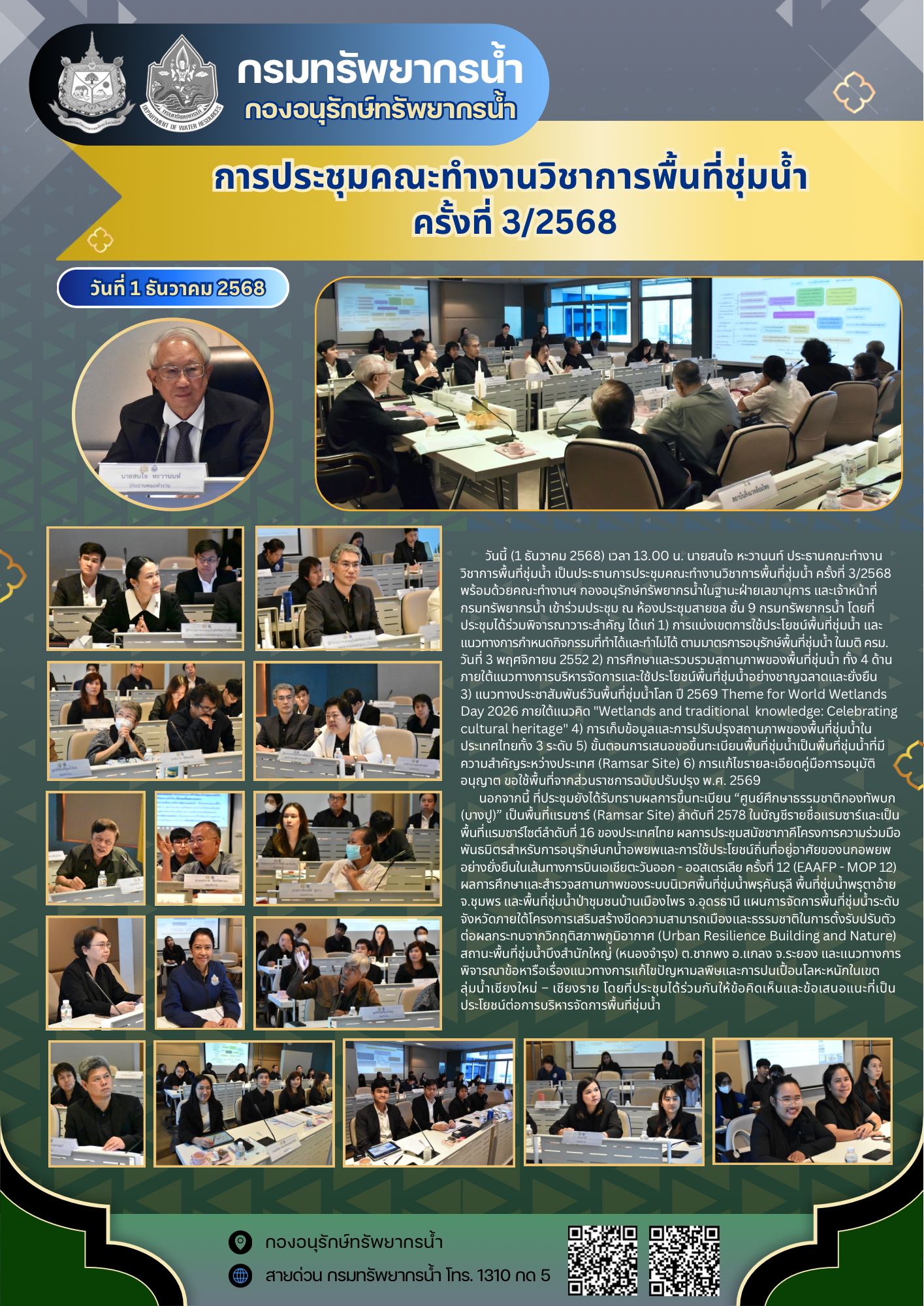 วันนี้ (1 ธันวาคม 2568) เวลา 13.00 น. นายสนใจ หะวานนท์ ประธานคณะทำงานวิชาการพื้นที่ชุ่มน้ำ เป็นประธานการประชุมคณะทำงานวิชาการพื้นที่ชุ่มน้ำ ครั้งที่ 3/2568 พร้อมด้วยคณะทำงานฯ กองอนุรักษ์ทรัพยากรน้ำในฐานะฝ่ายเลขานุการ และเจ้าหน้าที่กรมทรัพยากรน้ำ เข้าร่วมประชุม ณ ห้องประชุมสายชล ชั้น 9 กรมทรัพยากรน้ำ โดยที่ประชุมได้ร่วมพิจารณาวาระสำคัญ ได้แก่ 1) การแบ่งเขตการใช้ประโยชน์พื้นที่ชุ่มน้ำ และแนวทางการกำหนดกิจกรรมที่ทำได้และทำไม่ได้ ตามมาตรการอนุรักษ์พื้นที่ชุ่มน้ำ ในมติ ครม. วันที่ 3 พฤศจิกายน 2552 2) การศึกษาและรวบรวมสถานภาพของพื้นที่ชุ่มน้ำ ทั้ง 4 ด้าน ภายใต้แนวทางการบริหารจัดการและใช้ประโยชน์พื้นที่ชุ่มน้ำอย่างชาญฉลาดและยั่งยืน 3) แนวทางประชาสัมพันธ์วันพื้นที่ชุ่มน้ำโลก ปี 2569 Theme for World Wetlands Day 2026 ภายใต้แนวคิด "Wetlands and traditional knowledge: Celebrating