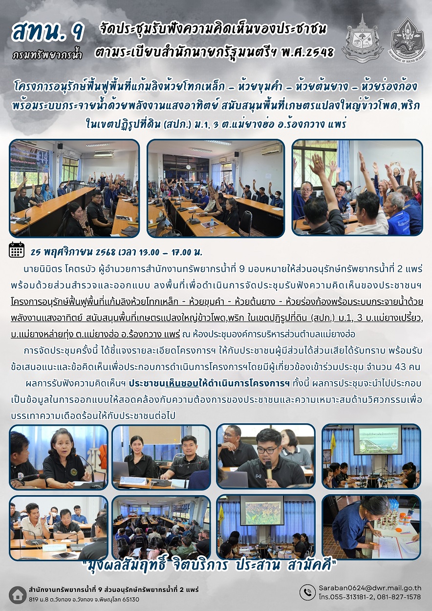นายนิมิตร โคตรบัว ผู้อำนวยการสำนักงานทรัพยากรน้ำที่ 9 มอบหมายให้ส่วนอนุรักษ์ทรัพยากรน้ำที่ 2 แพร่พร้อมด้วยส่วนสำรวจและออกแบบ ลงพื้นที่เพื่อดำเนินการจัดประชุมรับฟังความคิดเห็นของประชาชนฯ โครงการอนุรักษ์ฟื้นฟูพื้นที่แก้มลิงห้วยโทกเหล็ก - ห้วยขุมคำ - ห้วยต้นยาง - ห้วยร่องก้องพร้อมระบบกระจายน้ำด้วยพลังงานแสงอาทิตย์ สนับสนุนพื้นที่เกษตรแปลงใหญ่ข้าวโพด,พริก ในเขตปฏิรูปที่ดิน (สปก.) ม.1, 3 บ.แม่ยางเปรี้ยว, บ.แม่ยางหล่ายทุ่ง ต.แม่ยางฮ่อ อ.ร้องกวาง จ.แพร่ ณ องประชุมองค์การบริหารส่วนตำบลแม่ยางฮ่อ