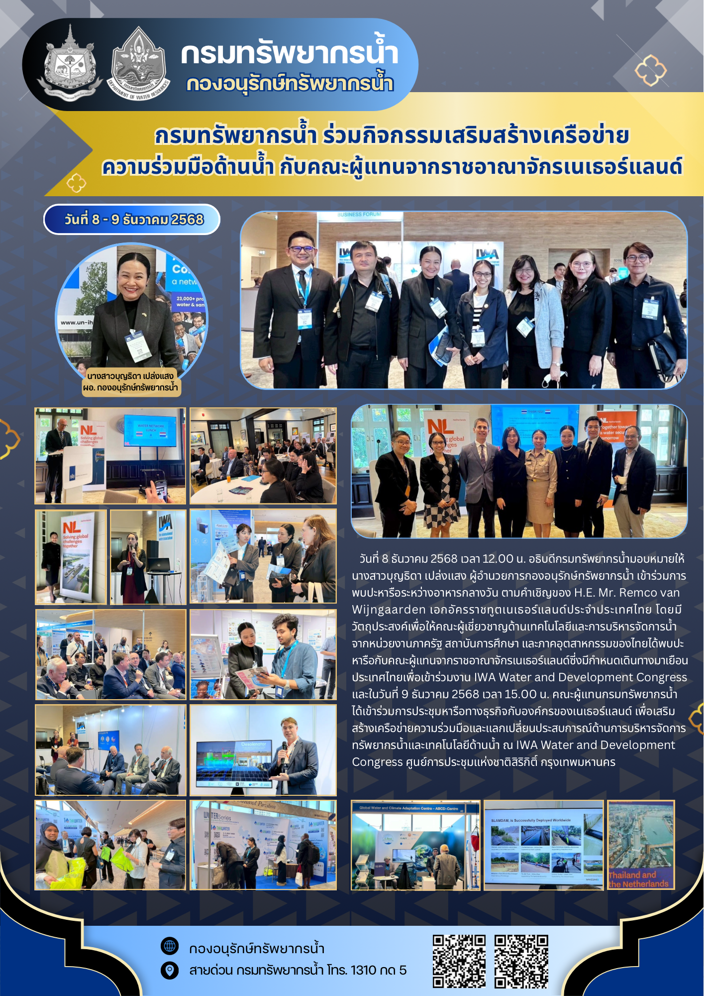 วันที่ 8 ธันวาคม 2568 เวลา 12.00 น. อธิบดีกรมทรัพยากรน้ำมอบหมายให้นางสาวบุญธิดา เปล่งแสง ผู้อำนวยการกองอนุรักษ์ทรัพยากรน้ำ เข้าร่วมการพบปะหารือระหว่างอาหารกลางวัน ตามคำเชิญของ H.E. Mr. Remco van Wijngaarden เอกอัครราชทูตเนเธอร์แลนด์ประจำประเทศไทย โดยมีวัตถุประสงค์เพื่อให้คณะผู้เชี่ยวชาญด้านเทคโนโลยีและการบริหารจัดการน้ำจากหน่วยงานภาครัฐ สถาบันการศึกษา และภาคอุตสาหกรรมของไทยได้พบปะหารือกับคณะผู้แทนจากราชอาณาจักรเนเธอร์แลนด์ซี่งมีกำหนดเดินทางมาเยือนประเทศไทยเพื่อเข้าร่วมงาน IWA Water and Development Congress และในวันที่ 9 ธันวาคม 2568 เวลา 15.00 น. คณะผู้แทนกรมทรัพยากรน้ำได้เข้าร่วมการประชุมหารือทางธุรกิจกับองค์กรของเนเธอร์แลนด์ เพื่อเสริมสร้างเครือข่ายความร่วมมือและแลกเปลี่ยนประสบการณ์ด้านการบริหารจัดการทรัพยากรน้ำและเทคโนโลยีด้านน้ำ ณ IWA Water and Development Congress ศูนย์การประชุมแห่งชาติสิริกิติ์ กรุงเทพมหานคร