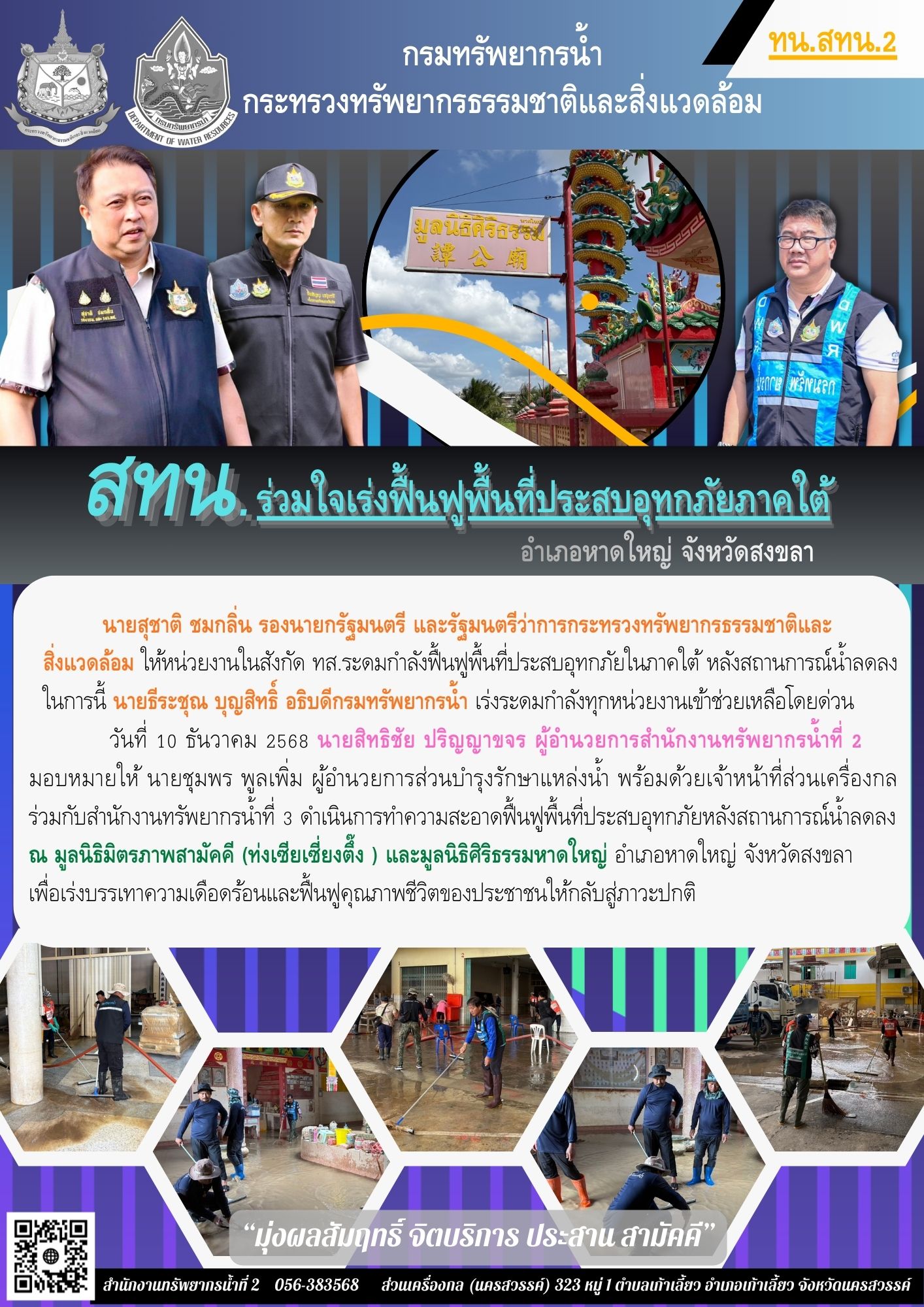 วันที่ 10 ธันวาคม 2568 นายสิทธิชัย ปริญญาขจร ผู้อำนวยการสำนักงานทรัพยากรน้ำที่ 2 มอบหมายให้ นายชุมพร พูลเพิ่ม ผู้อำนวยการส่วนบำรุงรักษาแหล่งน้ำ พร้อมด้วยเจ้าหน้าที่ส่วนเครื่องกล ร่วมกับสำนักงานทรัพยากรน้ำที่ 3 ดำเนินการทำความสะอาดฟื้นฟูพื้นที่ประสบอุทกภัยหลังสถานการณ์น้ำลดลง ณ มูลนิธิมิตรภาพสามัคคี (ท่งเซียเซี่ยงตึ๊ง ) และมูลนิธิศิริธรรมหาดใหญ่ อำเภอหาดใหญ่ จังหวัดสงขลา เพื่อเร่งบรรเทาความเดือดร้อนและฟื้นฟูคุณภาพชีวิตของประชาชนให้กลับสู่ภาวะปกติ