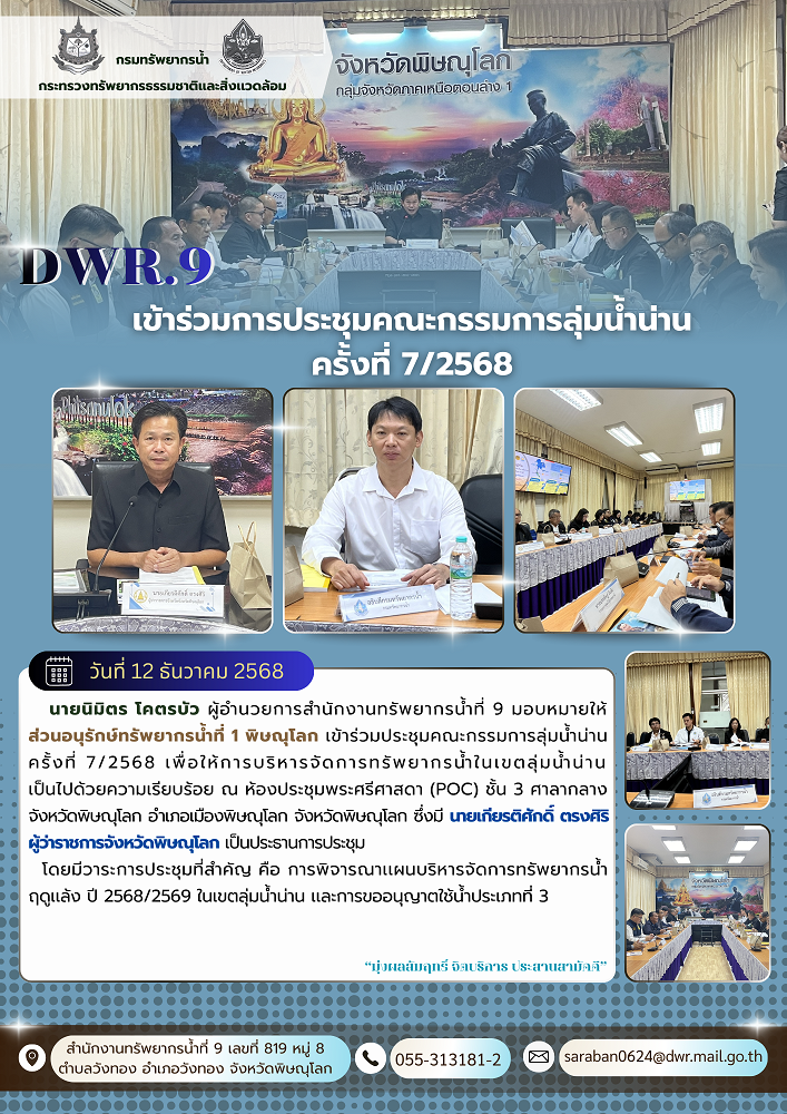 เข้าร่วมการประชุมคณะกรรมการลุ่มน้ำน่าน ครั้งที่ 7/2568 วันที่ 12 ธันวาคม 2568 นายนิมิตร โคตรบัว ผู้อำนวยการสำนักงานทรัพยากรน้ำที่ 9 มอบหมายให้ส่วนอนุรักษ์ทรัพยากรน้ำที่ 1 พิษณุโลก เข้าร่วมประชุมคณะกรรมการลุ่มน้ำน่าน ครั้งที่ 7/2568 เพื่อให้การบริหารจัดการทรัพยากรน้ำในเขตลุ่มน้ำน่าน เป็นไปด้วยความเรียบร้อย ณ ห้องประชุมพระศรีศาสดา (POC) ชั้น 3 ศาลากลางจังหวัดพิษณุโลก อำเภอเมืองพิษณุโลก จังหวัดพิษณุโลก ซึ่งมี นายเกียรติศักดิ์ ตรงศิริ ผู้ว่าราชการจังหวัดพิษณุโลก เป็นประธานการประชุม โดยมีวาระการประชุมที่สำคัญ คือ การพิจารณาเเผนบริหารจัดการทรัพยากรน้ำฤดูเเล้ง ปี 2568/2569 ในเขตลุ่มน้ำน่าน เเละการขออนุญาตใช้น้ำประเภทที่ 3