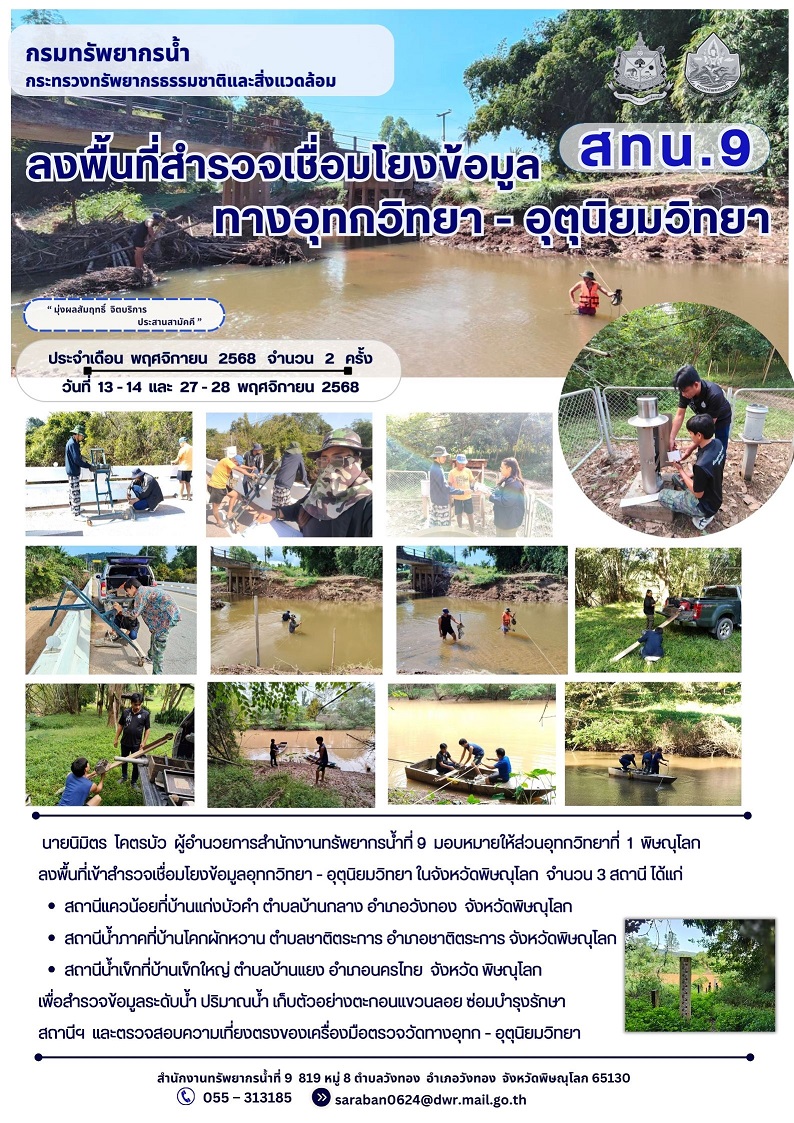 นายนิมิตร โคตรบัว ผู้อำนวยการสำนักงานทรัพยากรน้ำที่ 9 มอบหมายให้ส่วนอุทกวิทยาที่ 1 พิษณุโลก ลงพื้นที่เข้าสำรวจเชื่อมโยงข้อมูลอุทกวิทยา - อุตุนิยมวิทยา ในจังหวัดพิษณุโลก จำนวน 3 สถานี ได้แก่