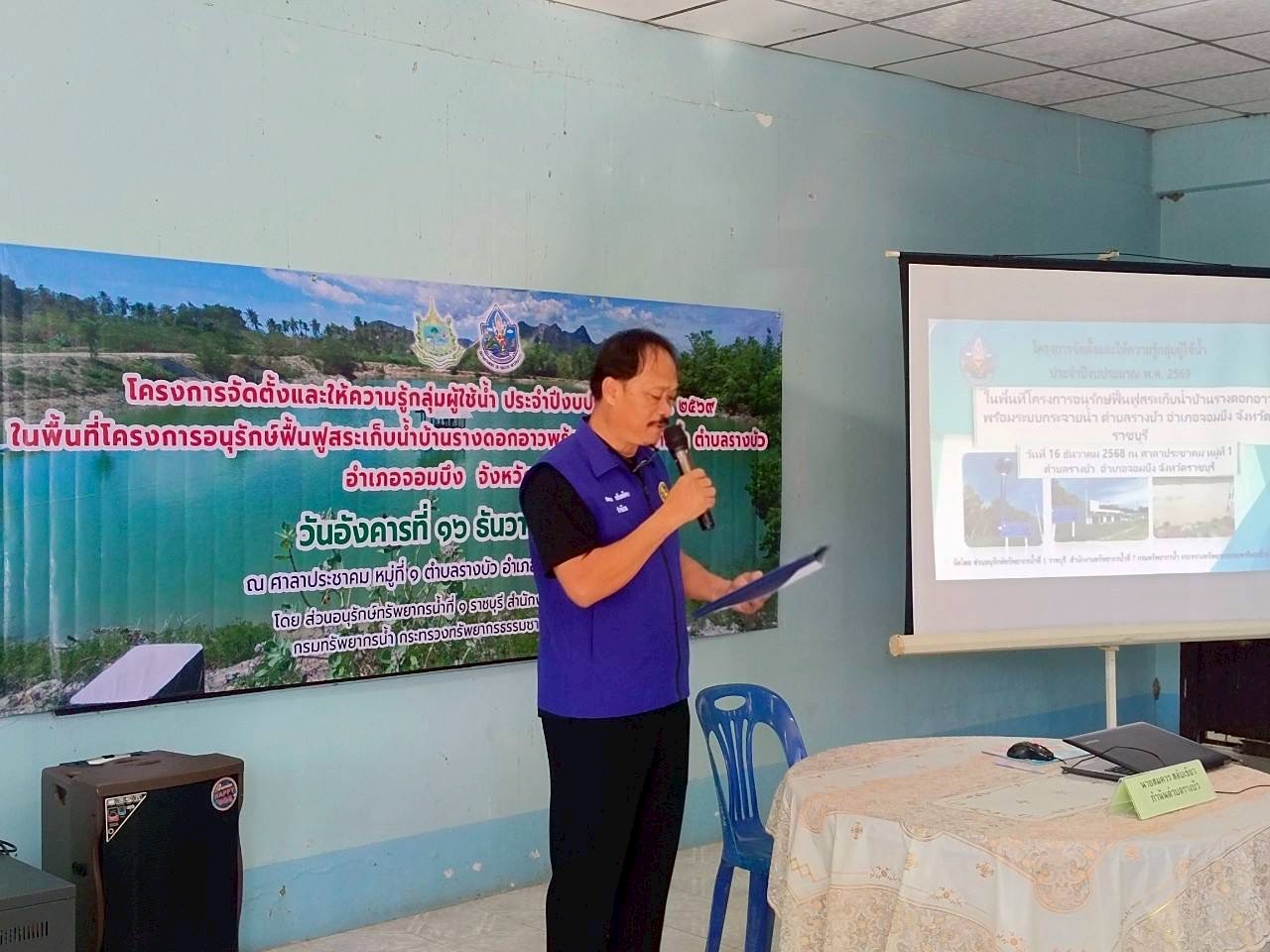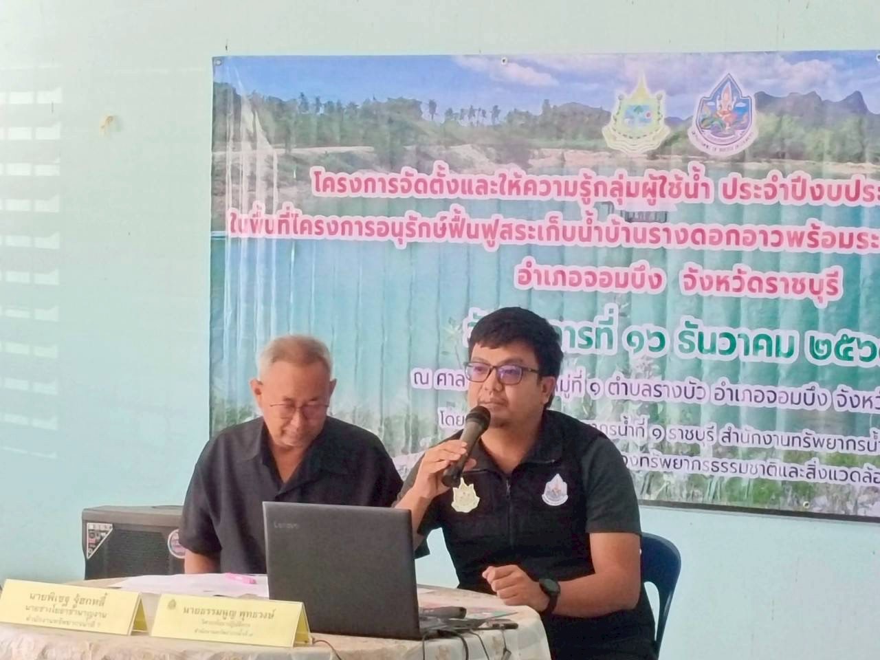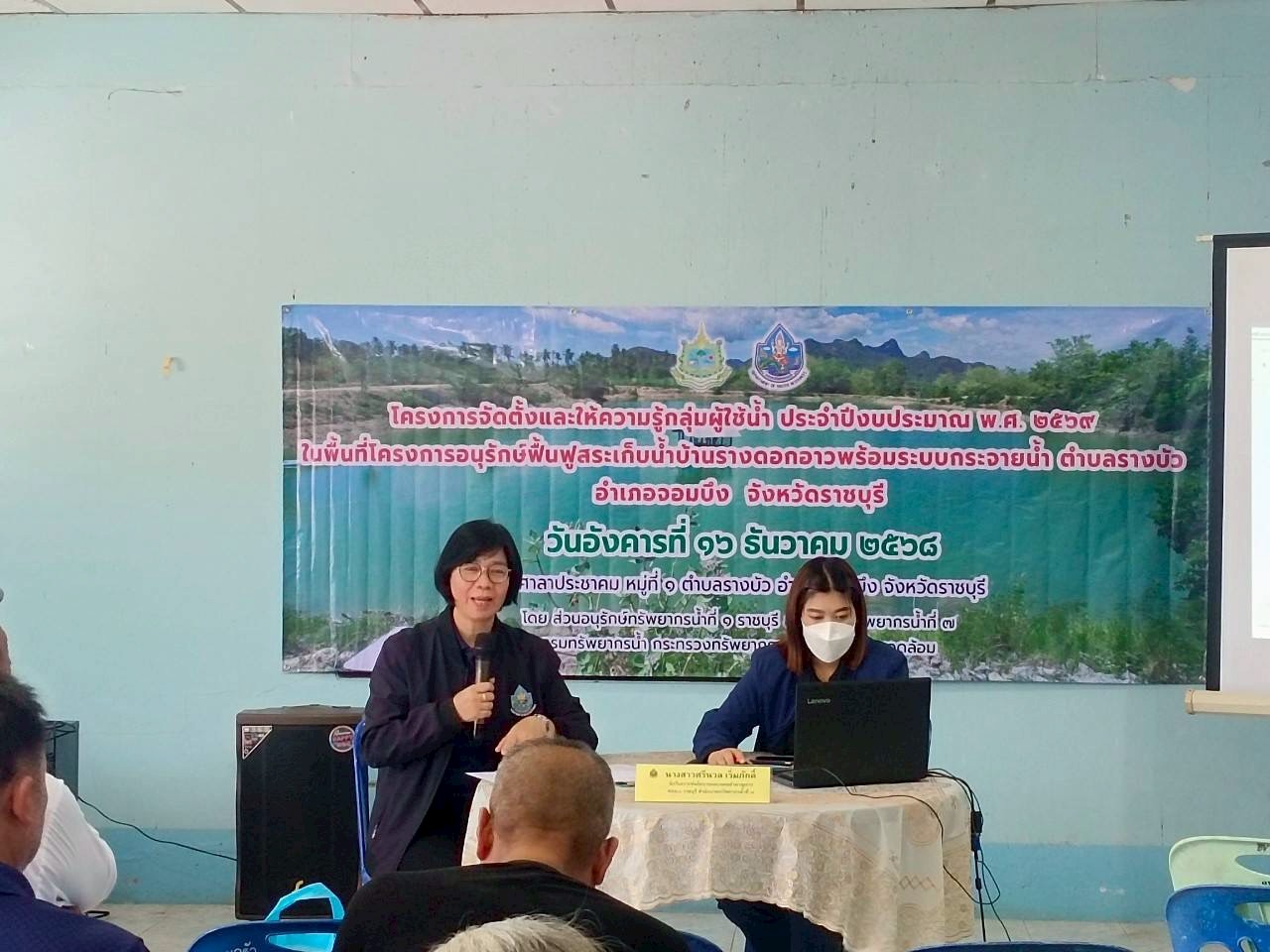 วันที่ 16 ธันวาคม 2568 นายอนันต์ โพธิ์พันธุ์ ผู้อำนวยการสำนักงานทรัพยากรน้ำที่ 7 มอบหมายให้ส่วนอนุรักษ์ทรัพยากรน้ำที่ 1 ราชบุรี จัดประชุมโครงการจัดตั้งและให้ความรู้กลุ่มผู้ใช้น้ำ ประจำปีงบประมาณ พ.ศ.2569 ในพื้นที่โครงการอนุรักษ์ฟื้นฟูสระเก็บน้ำบ้านรางดอกอาวพร้อมระบบกระจายน้ำ ตำบลรางบัว อำเภอจอมบึง จังหวัดราชบุรี โดยมีนายสมควร สลับเขียว กำนันตำบลรางบัว เป็นประธานในพิธีเปิด การจัดโครงการในครั้งนี้มีวัตถุประสงค์เพื่อเสริมสร้างความรู้ความเข้าใจในการดูแลบำรุงรักษาแหล่งน้ำและระบบกระจายน้ำ การใช้ประโยชน์ร่วมกัน กระบวนการมีส่วนร่วมในการจัดตั้งและให้ความรู้กลุ่มผู้ใช้น้ำ ผู้เข้าร่วมโครงการฯ ประกอบด้วย องค์กรปกครองส่วนท้องถิ่น ผู้นำชุมชน และประชาชนผู้ใช้ประโยชน์จากแหล่งน้ำโครงการ จำนวน 40 คน