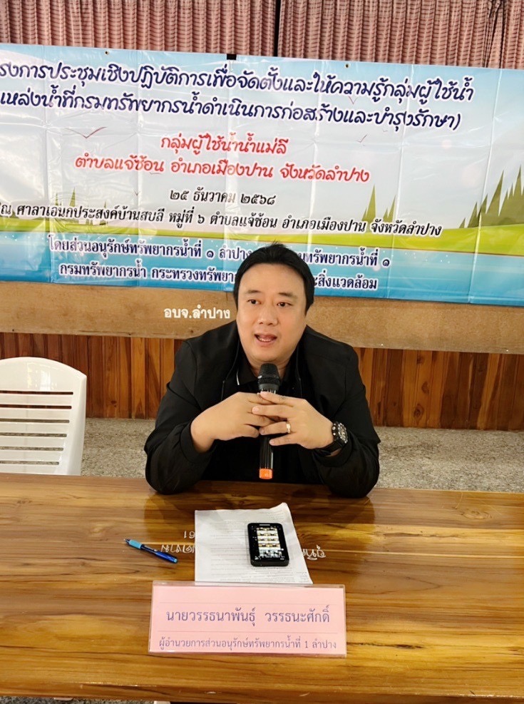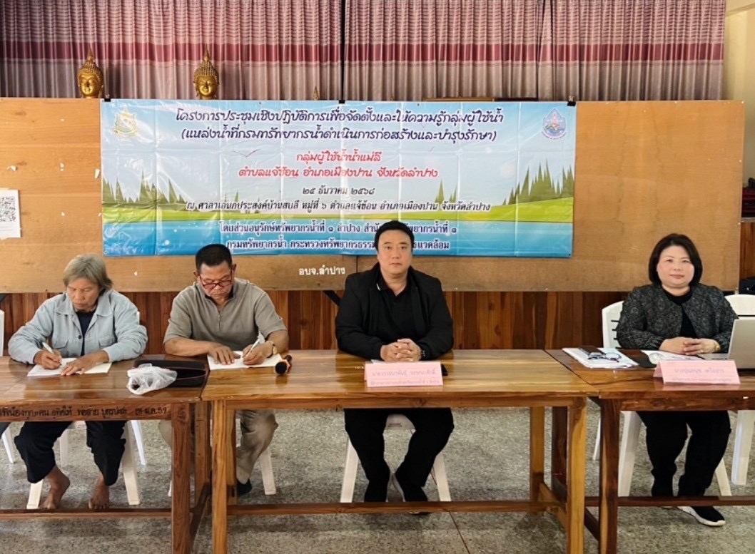 นางสาวสุพัดสอน สีมืด ผู้อำนวยการสำนักงานทรัพยากรน้ำที่ 1 มอบหมายให้ส่วนอนุรักษ์ทรัพยากรน้ำที่ 1 ลำปาง จัดโครงการประชุมเชิงปฏิบัติการเพื่อจัดตั้งและให้ความรู้กลุ่มผู้ใช้น้ำ (แหล่งน้ำที่กรมทรัพยากรน้ำดำเนินการก่อสร้างและบำรุงรักษา)กลุ่มผู้ใช้น้ำน้ำแม่ลี ณ ศาลาอเนกประสงค์บ้านสบลี หมู่ที่ 6 ตำบลแจ้ซ้อน อำเภอเมืองปาน จังหวัดลำปาง มีผู้เข้าร่วมประชุมประกอบด้วย กำนัน ผู้ใหญ่บ้าน ประชาชนในพื้นที่ และกลุ่มผู้ใช้น้ำน้ำแม่ลี จำนวน 45 คน ซึ่งส่วนอนุรักษ์ทรัพยากรน้ำที่ 1 ลำปาง ได้บรรยายให้ความรู้ทางวิชาการสร้างความเข้าใจเกี่ยวกับบทบาทหลักของกรมทรัพยากรน้ำ และภารกิจของส่วนอนุรักษ์ทรัพยากรน้ำที่ 1 ลำปาง รวมทั้งจัดตั้งกลุ่มผู้ใช้น้ำในพื้นที่ดังกล่าว