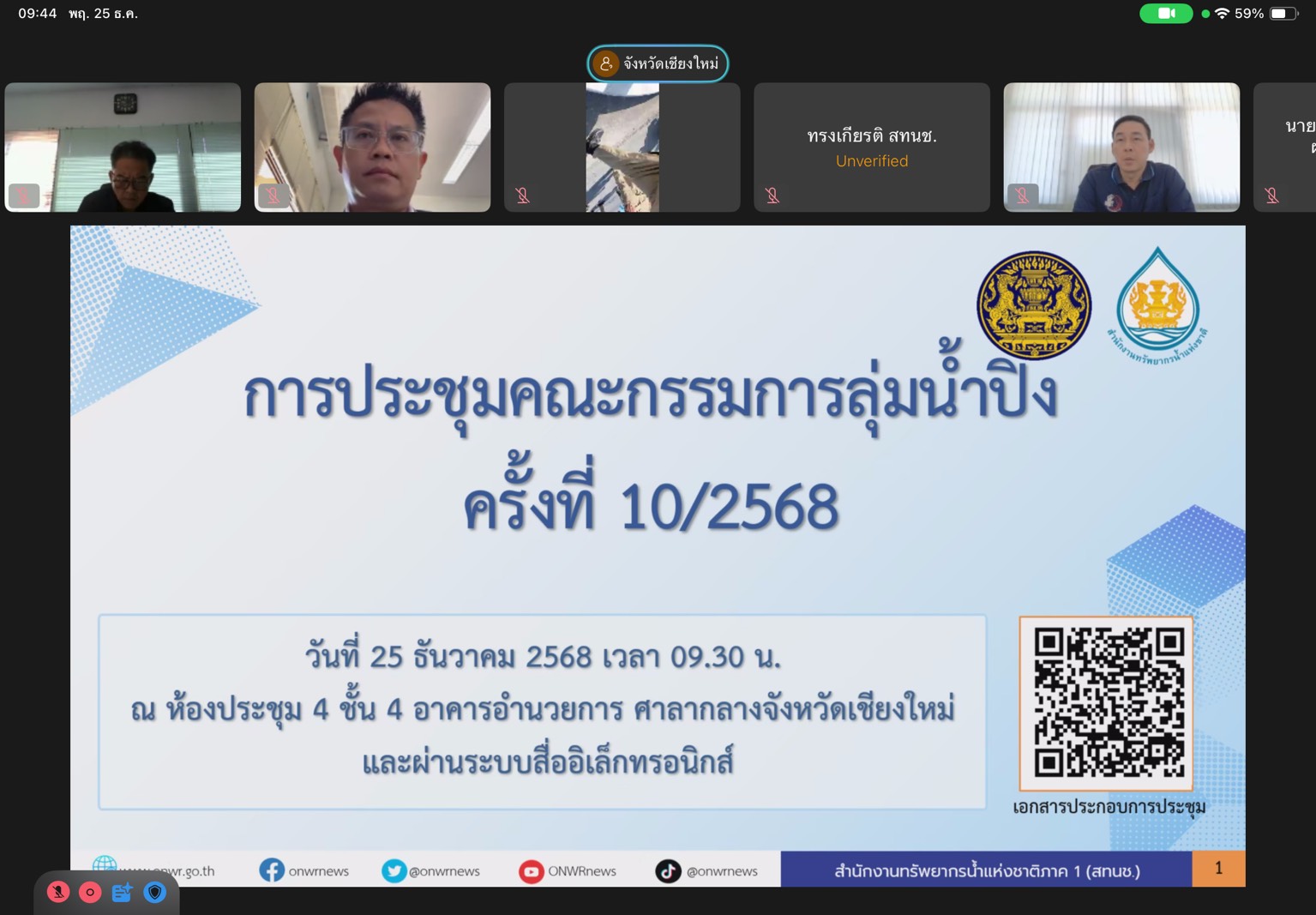 นางสาวสุพัดสอน สีมืด ผู้อำนวยการสำนักงานทรัพยากรน้ำที่ 1 มอบหมายให้นายศิริศักดิ์ เกษารัตน์ ผู้อำนวยการส่วนการจัดสรรน้ำที่ 1 ลำปาง พร้อมเจ้าหน้าที่ เข้าร่วมประชุมคณะกรรมการลุ่มน้ำปิง ครั้งที่ 10/2568 ผ่านสื่ออิเล็กทรอนิกส์ Webex Meeting โดยมี นายศิวกร บัวป้อง รองผู้ว่าราชการจังหวัดเชียงใหม่ เป็นประธานการประชุม ณ ห้องประชุม 4 ศาลากลางจังหวัดเชียงใหม่ ซึ่งมีวาระการประชุมเรื่องสืบเนื่องที่เกี่ยวข้องกับ กรมทรัพยากรน้ำในการขออนุญาตใช้น้ำประเภทที่สาม ของการประปาส่วนภูมิภาคสาขาเชียงใหม่ (ชั้นพิเศษ) โดยตามมติที่ประชุมคณะกรรมการลุ่มน้ำปิง ครั้งที่ 8/2568 เมื่อวันที่ 21 ตุลาคม 2568 คณะกรรมการฯ ได้เห็นชอบผ่านคำขออนุญาตการใช้น้ำของการประปาส่วนภูมิภาคสาขาเชียงใหม่ (ชั้นพิเศษ) เพื่อให้กรมทรัพยากรน้ำ นำความเห็นเสนอต่อ กนช. ต่อไป ซึ่งภายหลังพบว่ามีจุดสูบน้ำจำนวน 2 แห่ง ได้แก่ การประปาส่วนภูมิภาคสาขาเชียงใหม่ (ชั้นพิเศษ) สถานีผลิตน้ำป่าตัน และการประปาส่วนภูมิภาคสาขาเชียงใหม่ (ชั้นพิเศษ) สถานีผลิตน้ำอุโมงค์ ตั้งอยู่ในเขตทางน้ำชลประทาน นั้น