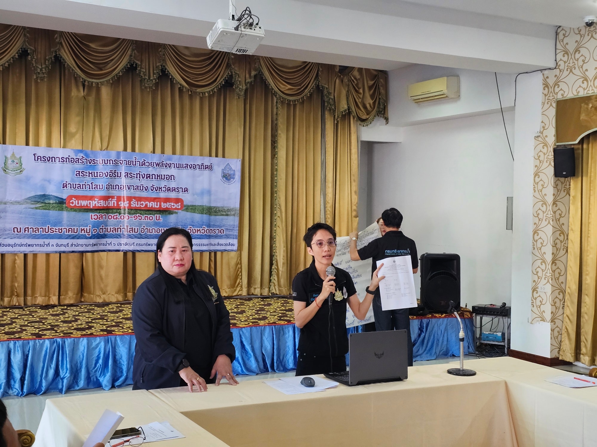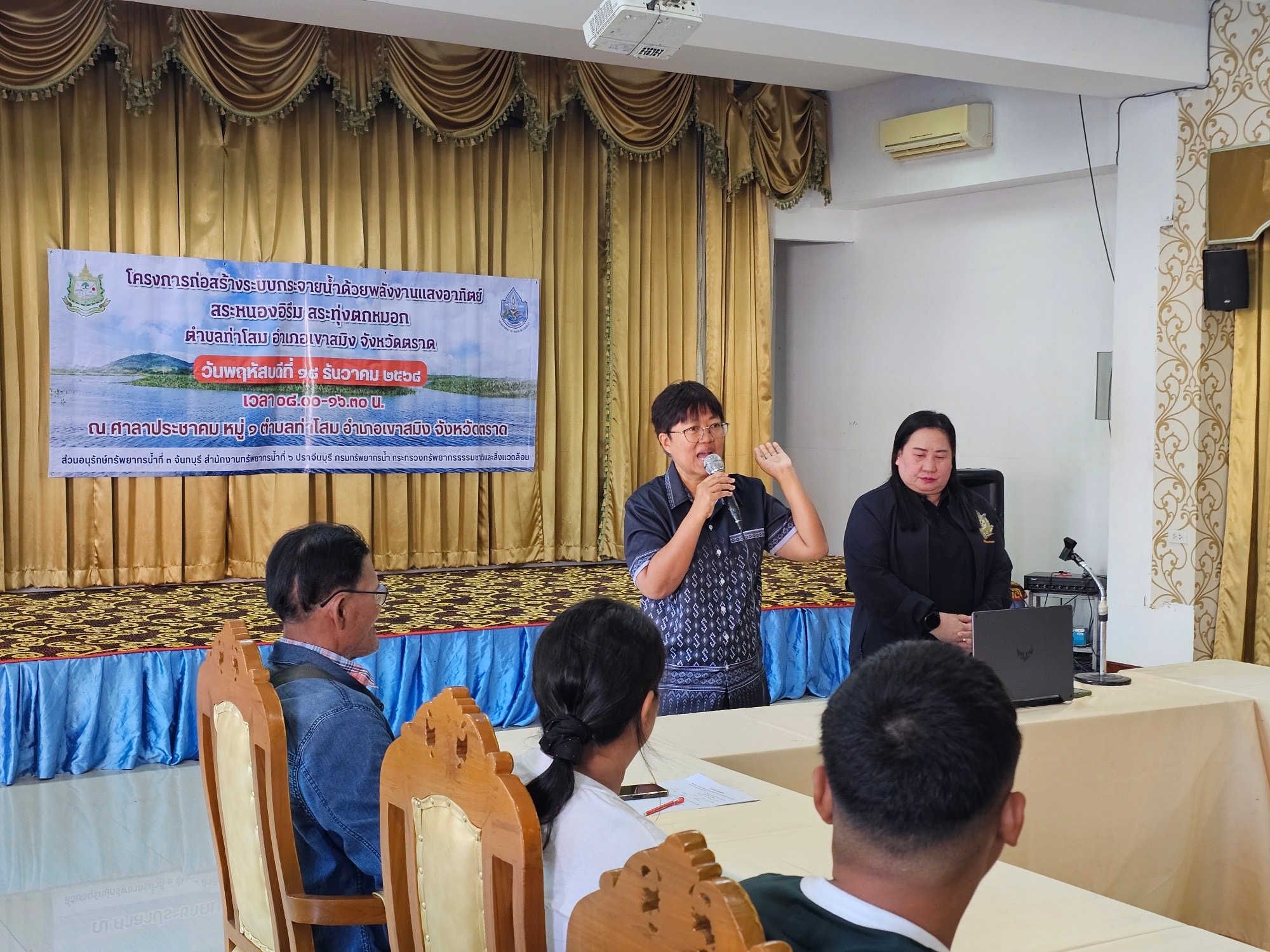 วันที่ 18 ธันวาคม 2568 สำนักงานทรัพยากรน้ำที่ 6 โดยส่วนอนุรักษ์ทรัพยากรน้ำที่ 3 จันทบุรี ดำเนินโครงการจัดตั้งกลุ่มผู้ใช้น้ำ โครงการก่อสร้างระบบกระจายน้ำด้วยพลังงานแสงอาทิตย์สระหนองอิรึม สระทุ่งตกหมอก ตำบลท่าโสม อำเภอเขาสมิง จังหวัดตราด ณ ศาลาประชาคมหมู่ที่ 1 ตำบลท่าโสม อำเภอเขาสมิง จังหวัดตราด โดยมีวัตถุประสงค์ เพื่อจัดตั้งกลุ่มผู้ใช้น้ำ แลกเปลี่ยนเรียนรู้ประสบการณ์ ถ่ายทอดเจตนารมณ์การบริหารจัดการทรัพยากรน้ำแก่กลุ่มผู้ใช้น้ำ ส่งเสริมการมีส่วนร่วมในการดูแล บำรุงรักษาแหล่งน้ำในพื้นที่ให้เกิดประโยชน์สูงสุด เสริมสร้างความรู้ความเข้าใจการบริหารจัดการน้ำ อนุรักษ์ พัฒนา และการดูแลบำรุงรักษาแหล่งน้ำของกรมทรัพยากรน้ำ และการเพิ่มประสิทธิภาพการใช้ประโยชน์จากแหล่งน้ำ การจัดทำข้อมูลรายงานปริมาณการใช้น้ำเพื่อการเกษตร อุปโภค บริโภค สำหรับใช้วางแผนการใช้น้ำได้อย่างต่อเนื่อง