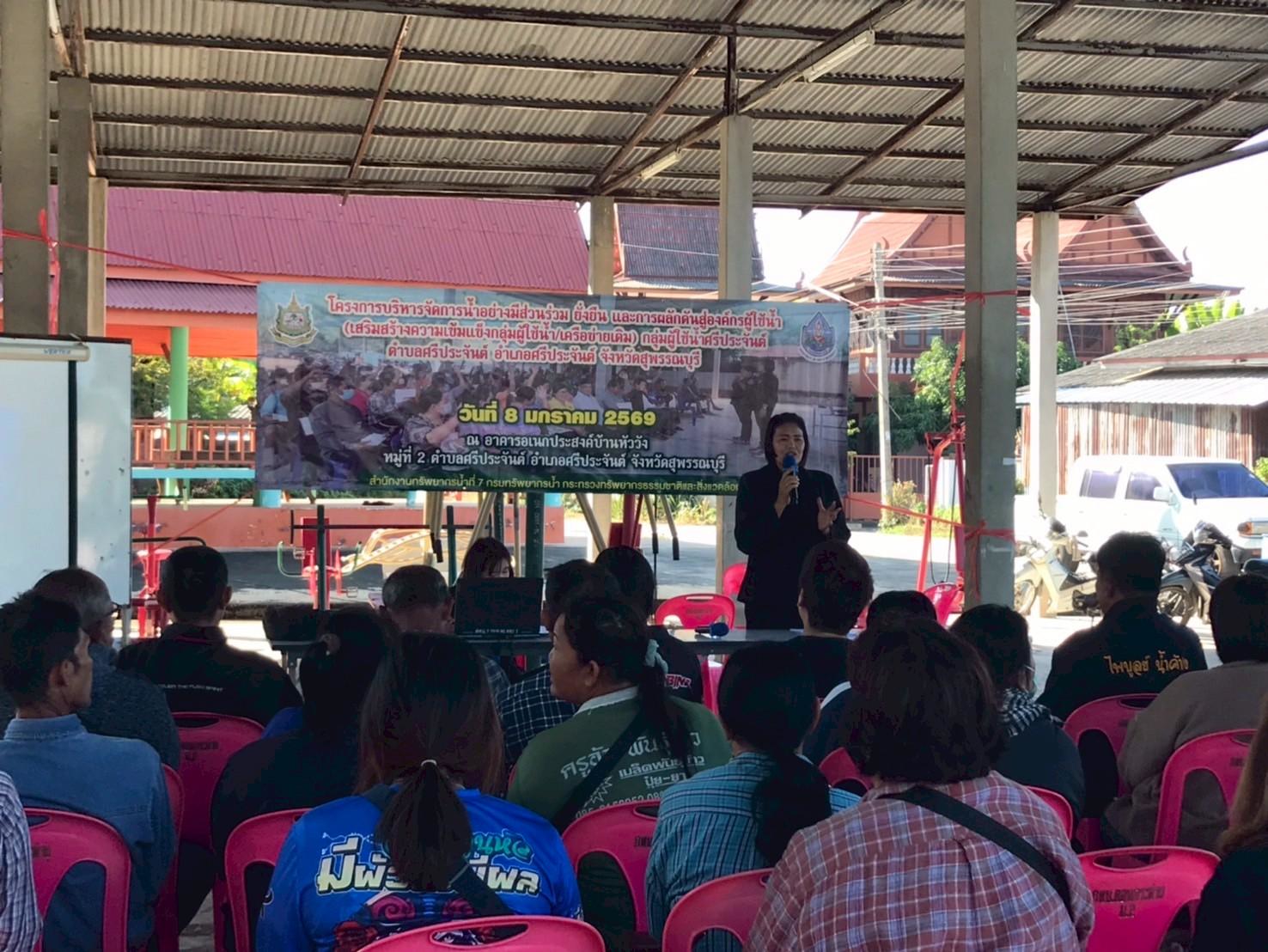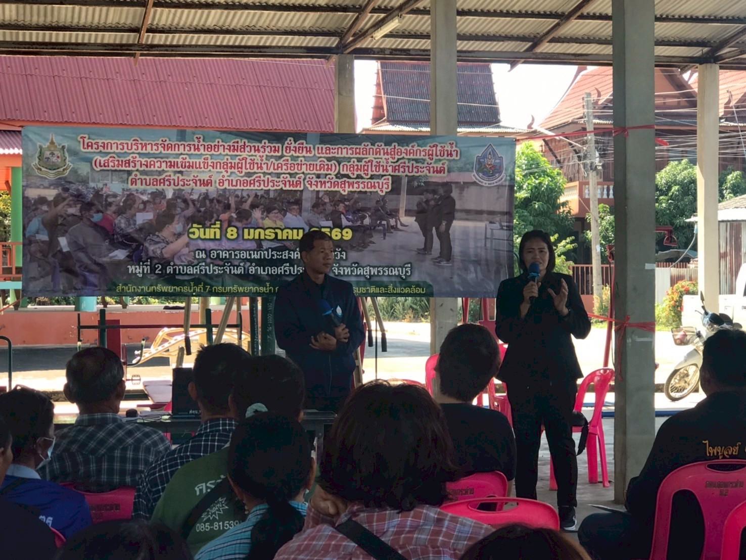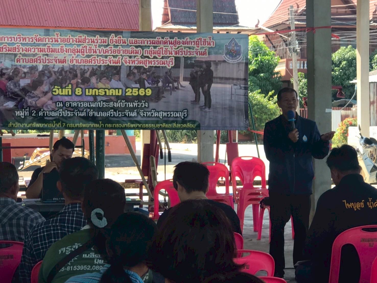 มอบหมายให้ ส่วนอนุรักษ์ทรัพยากรน้ำที่ 2 สุพรรณบุรี ดำเนินการจัดโครงการบริหารจัดการน้ำอย่างมีส่วนร่วม ยั่งยืน และการผลักดันสู่องค์กรผู้ใช้น้ำ (เสริมสร้างความเข้มแข็งกลุ่มผู้ใช้น้ำ/เครือข่ายเดิม) กลุ่มผู้ใช้น้ำศรีประจันต์ ณ อาคารอเนกประสงค์บ้านหัววัง หมู่ที่ 2 ตำบลศรีประจันต์ อำเภอศรีประจันต์ จังหวัดสุพรรณบุรี โดยมีนายเวทวัฒน์ เวทสรณสุธี นายกเทศมนตรีตำบลศรีประจันต์ เป็นประธานฯ ผู้เข้าร่วมโครงการฯ ประกอบด้วย กลุ่มผู้ใช้น้ำเดิม และเครือข่าย ผู้มีส่วนได้ส่วนเสียที่เกี่ยวข้อง ภาครัฐ ภาคเอกชน และประชาชนที่ได้รับประโยชน์จากโครงการของกรมทรัพยากรน้ำ จำนวน 70 คน ซึ่งมีวัตถุประสงค์เพื่อสนับสนุนกลุ่มเครือข่ายให้มีการบริหารจัดการทรัพยากรน้ำ และสนับสนุนกิจกรรมการดำเนินงานของกลุ่มเครือข่ายให้มีการบริหารจัดการกลุ่มเครือข่ายอย่างต่อเนื่อง รวมทั้งเพิ่มความเข้มแข็งของกลุ่มเครือข่าย ให้เกิดการรวมกลุ่ม ดูแล บำรุงรักษาแหล่งน้ำให้อยู่สภาพดีและมีประสิทธิภาพ สามารถจัดสรรแบ่งปันน้ำระหว่างสมาชิกในกลุ่มได้อย่าง เป็นธรรมและเกิดประโยชน์สูงสุด และสร้างความมั่นคงในชีวิต เสริมสร้างศักยภาพการบริหารจัดการทรัพยากรน้ำ และผลักดันสู่องค์กรผู้ใช้น้ำ