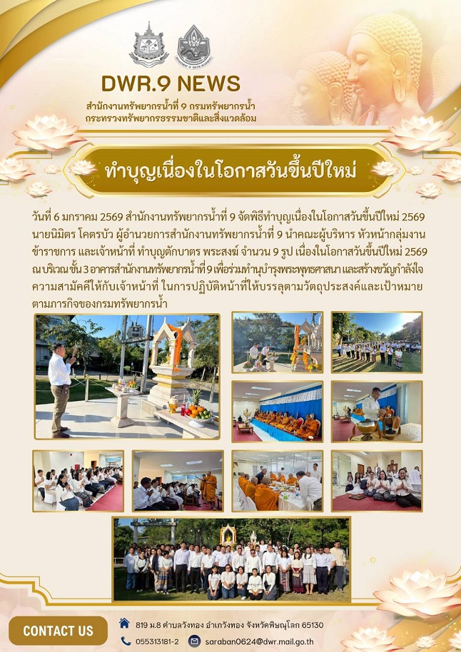 วันที่ 6 มกราคม 2569 สำนักงานทรัพยากรน้ำที่ 9 จัดพิธีทำบุญเนื่องในโอกาสวันขึ้นปีใหม่ 2569 นายนิมิตร โคตรบัว ผู้อำนวยการสำนักงานทรัพยากรน้ำที่ 9 นำคณะผู้บริหาร หัวหน้ากลุ่มงาน ข้าราชการ และเจ้าหน้าที่ ทำบุญตักบาตร พระสงฆ์ จำนวน 9 รูป เนื่องในโอกาสวันขึ้นปีใหม่ 2569 ณ บริเวณ ชั้น 3 อาคารสำนักงานทรัพยากรน้ำที่ 9 เพื่อร่วมทำนุบำรุงพระพุทธศาสนา และสร้างขวัญกำลังใจความสามัคคีให้กับเจ้าหน้าที่ ในการปฏิบัติหน้าที่ให้บรรลุตามวัตถุประสงค์และเป้าหมายตามภารกิจของกรมทรัพยากรน้ำ