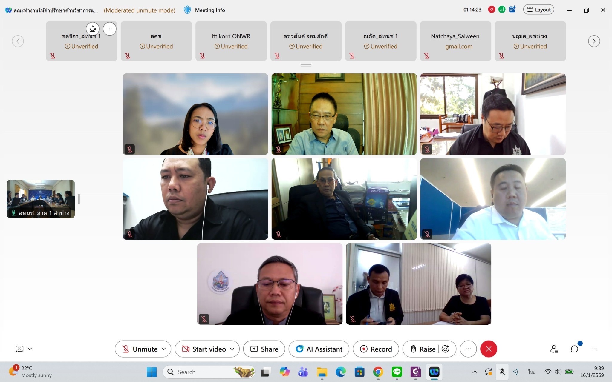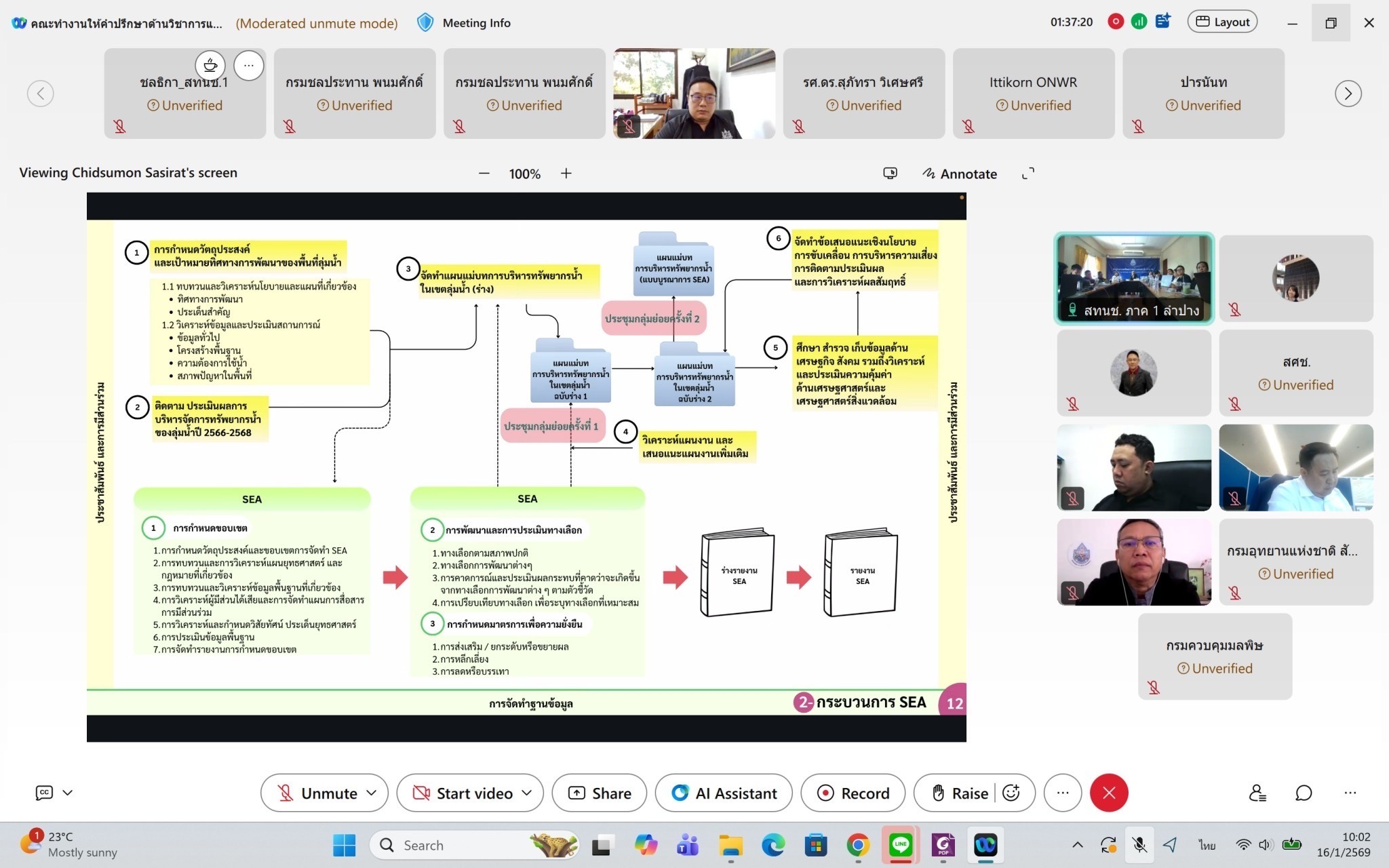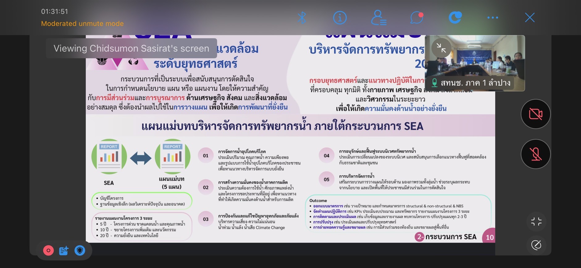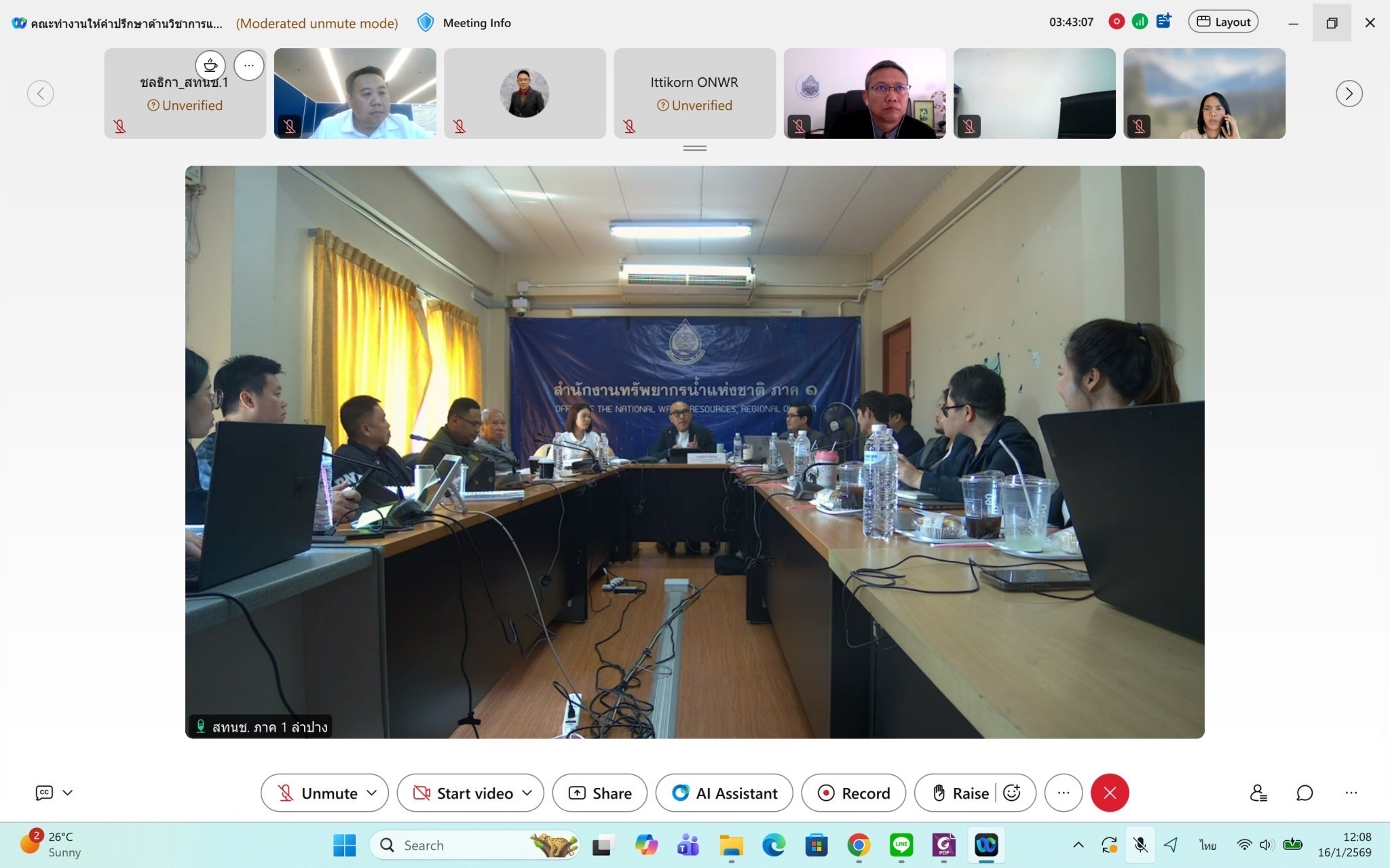 นางสาวสุพัดสอน สีมืด ผู้อำนวยการสำนักงานทรัพยากรน้ำที่ 1 มอบหมายนายวราห์ มิตรานนท์ ผู้อำนวยการส่วนอนุรักษ์ทรัพยากรน้ำที่ 2 เชียงใหม่ และ นายวรรธนาพันธุ์ วรรธนะศักดิ์ ผู้อำนวยการส่วนอนุรักษ์ทรัพยากรน้ำที่ 1 ลำปาง เข้าร่วมประชุมพิจารณารายงานการ เริ่มงาน (Inception Report) โครงการศึกษาจัดทำแผนแม่บทการบริหารจัดการทรัพยากรน้ำ ในเขตลุ่มน้ำปิง ปรับปรุงช่วงที่ 1 (พ.ศ.2566-2580) วันศุกร์ที่ 16 มกราคม 2569 เวลา 09.30 น. – 12.00 น. ณ ห้องประชุมสำนักงานทรัพยากรน้ำแห่งชาติภาค 1 ผ่านสื่ออิเล็กทรอนิกส์ โดยมีนายอนันต์ เพ็ชร์หนู ผู้อำนวยการสำนักงานทรัพยากรน้ำแห่งชาติภาค 1 เป็นประธานการประชุม