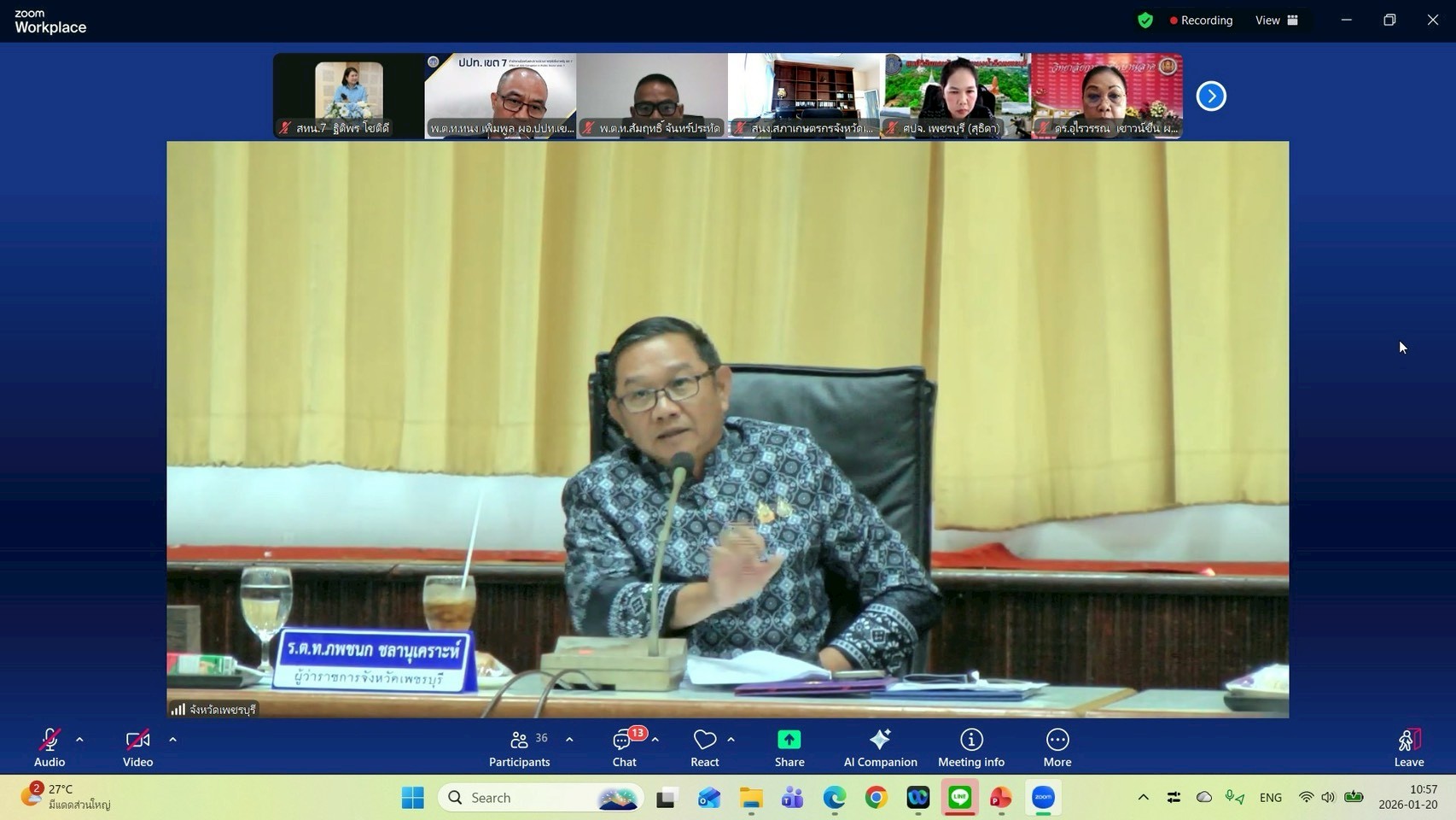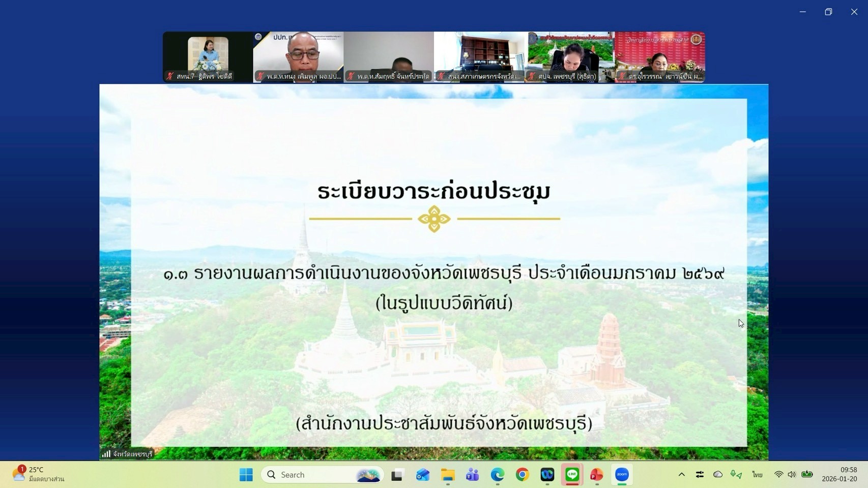 วันที่ 20 มกราคม 2569 นายอนันต์ โพธิ์พันธุ์ ผู้อำนวยการสำนักงานทรัพยากรน้ำที่ 7 มอบหมายให้ส่วนอนุรักษ์ทรัพยากรน้ำที่ 3 เพชรบุรี เข้าร่วมประชุมคณะกรมการจังหวัดและหัวหน้าส่วนราชการจังหวัดเพชรบุรี ประจำเดือนมกราคม 2569 ครั้งที่ 1/2569 ผ่านระบบสื่ออิเล็กทรอนิกส์ (Zoom Meeting) โดยมี ร้อยตำรวจโท ภพชนก ชลานุเคราะห์ ผู้ว่าราชการจังหวัดเพชรบุรี เป็นประธานฯ ทั้งนี้ เพื่อรับทราบนโยบาย ติดตามความก้าวหน้า และรายงานผลการดำเนินงานตามภารกิจของหน่วยงานที่เกี่ยวข้อง
