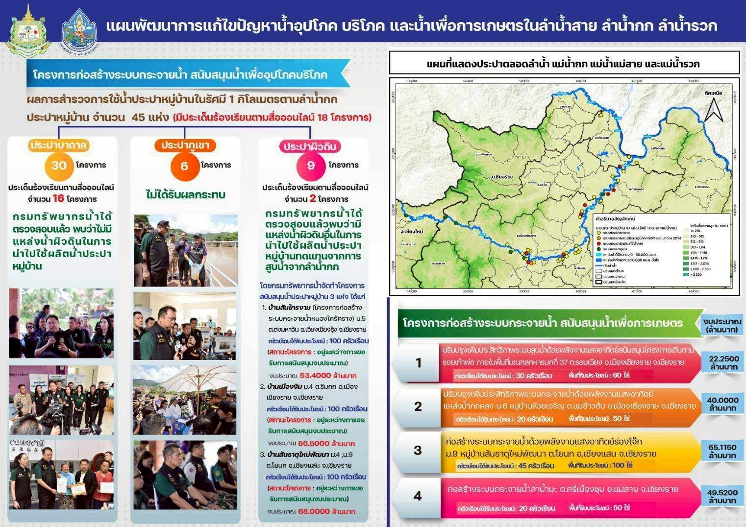 โดยในที่ประชุมส่วนอนุรักษ์ทรัพยากรน้ำที่ 4 เชียงราย ได้ทำการชี้เเจงแผนการพัฒนาแก้ไขปัญหาน้ำอุปโภค บริโภค และน้ำเพื่อการเกษตรในแม่น้ำกก แม่น้ำสาย แม่น้ำรวก โดยกรทรัพยากรน้ำ จัดทำโครงการสนับสนุนน้ำอุปโภค บริโภค 3 แห่ง ได้แก่